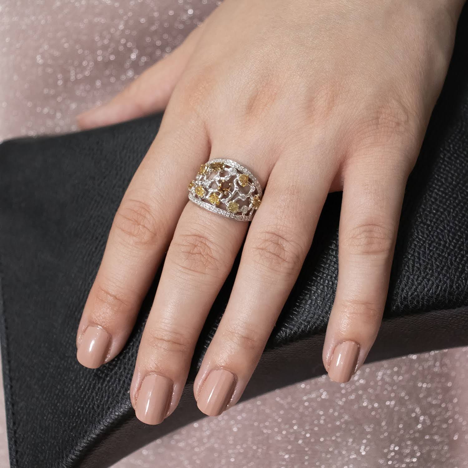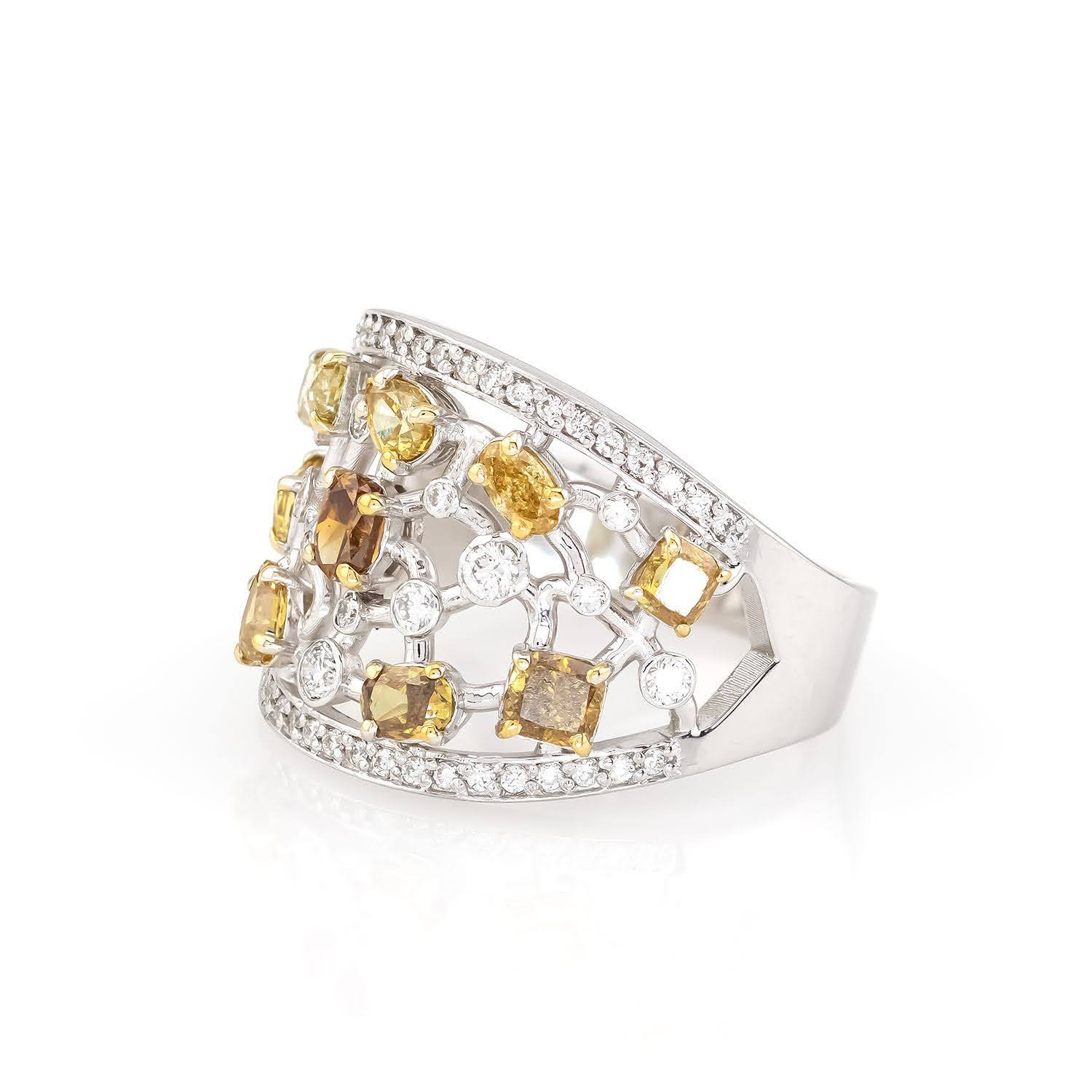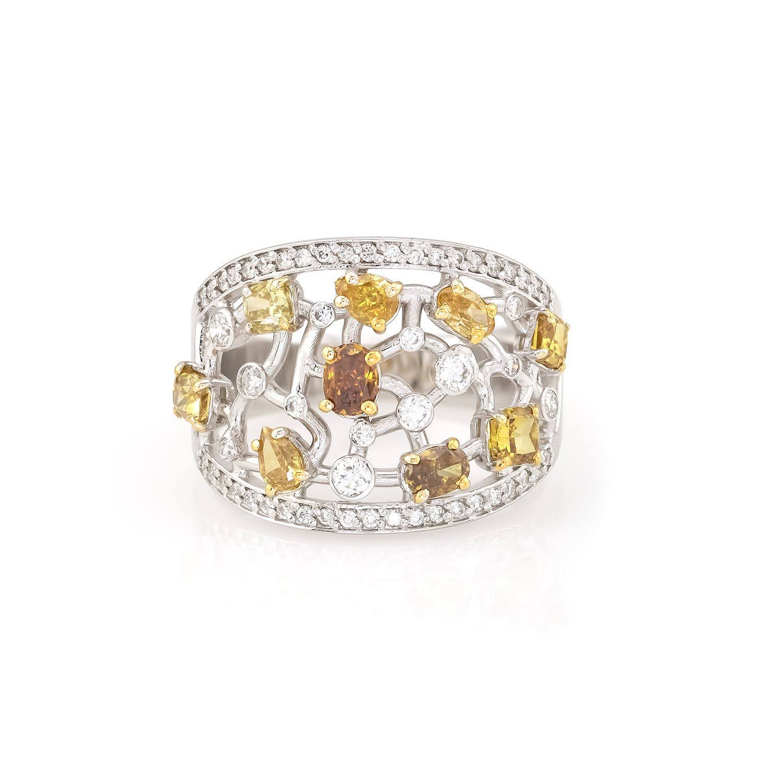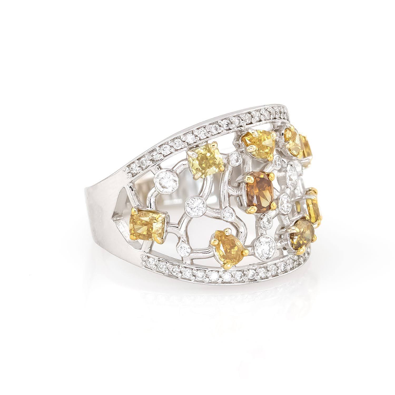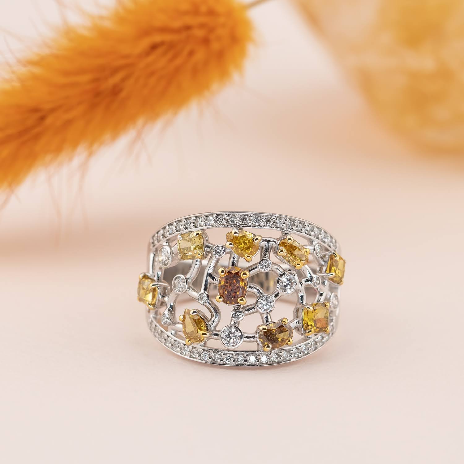 Un inel spectaculos care îmbină rafinamentul designului modern cu strălucirea diamantelor. Realizat din aur alb, acest inel se remarcă prin structura sa deschisă, decorată cu diamante în nuanțe de galben, portocaliu și alb, care creează un joc fascinant de culori și lumină. Fiecare diamant este montat cu atenție, subliniind eleganța piesei și măiestria artizanilor. Ideal pentru ocazii speciale sau pentru a adăuga o notă sofisticată garderobei, acest inel este o expresie a luxului și a stilului desăvârșit. O alegere perfectă pentru cei care apreciază bijuteriile statement.