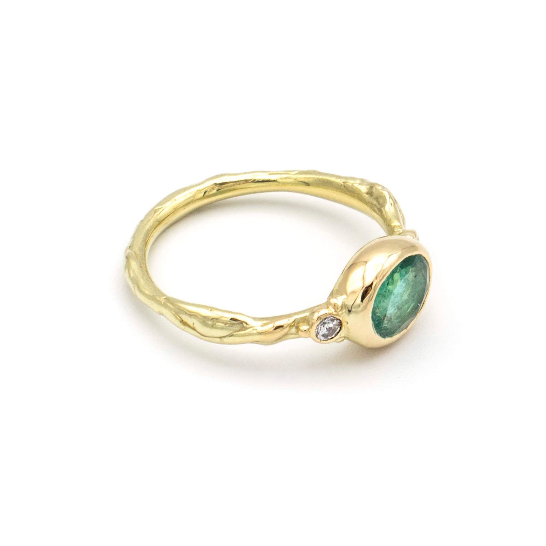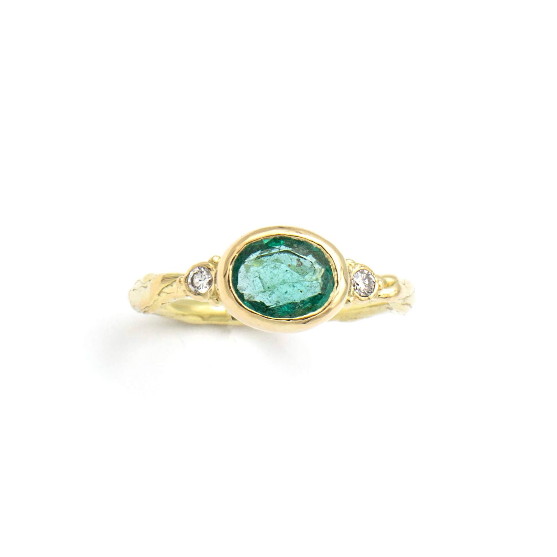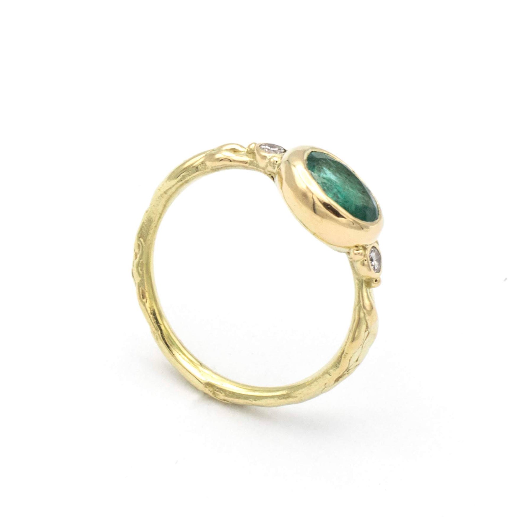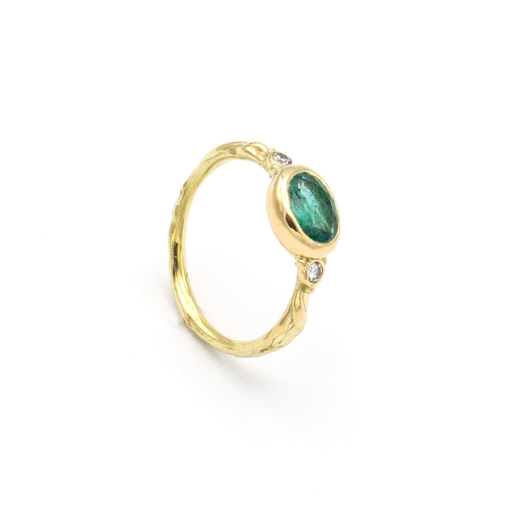 Inel din aur decorat cu un smarald verde oval este flancat de două diamante delicate. Designul său combină stilul clasic cu detalii moderne, oferindu-i un aspect sofisticat și unic.