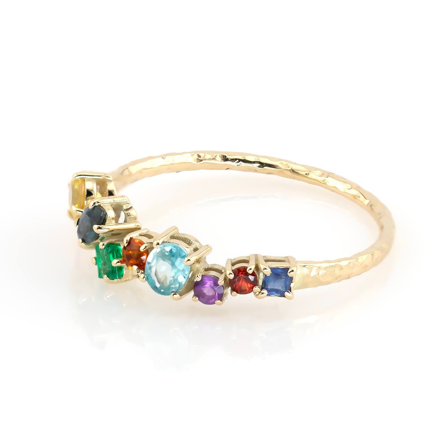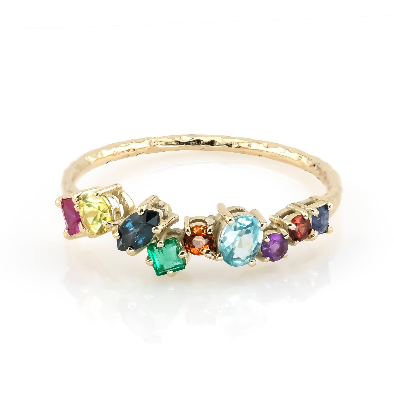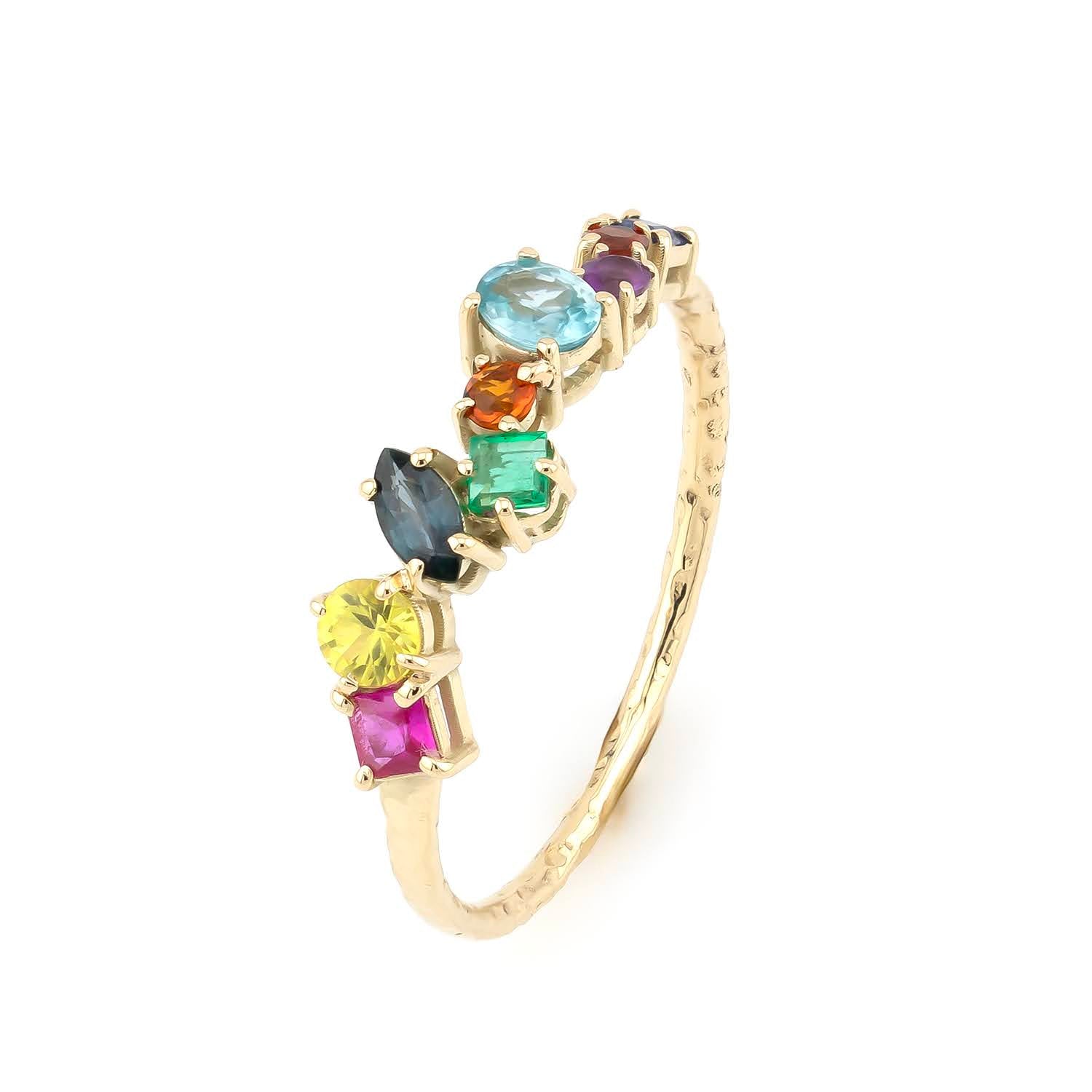 Un inel vibrant și plin de viață, realizat din aur galben de 14K, împodobit cu o varietate de pietre prețioase în culori intense. Fiecare piatră este atent montată pentru a crea un curcubeu spectaculos de nuanțe și forme. Designul sofisticat și detaliile lucrate manual adaugă o notă de unicitate și expresivitate. Ideal pentru a sărbători momente speciale sau pentru a aduce un strop de culoare în fiecare zi, acest inel este o declarație de stil și bucurie.