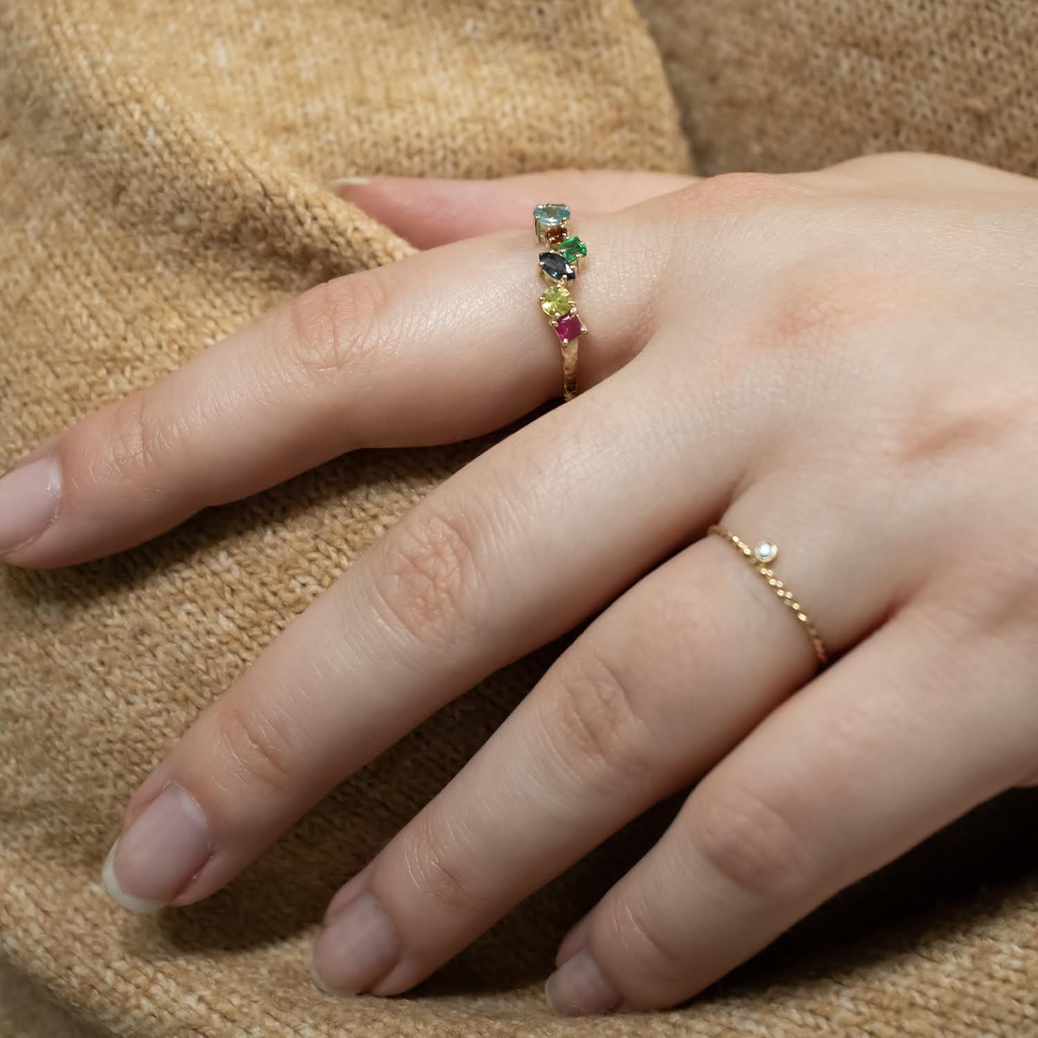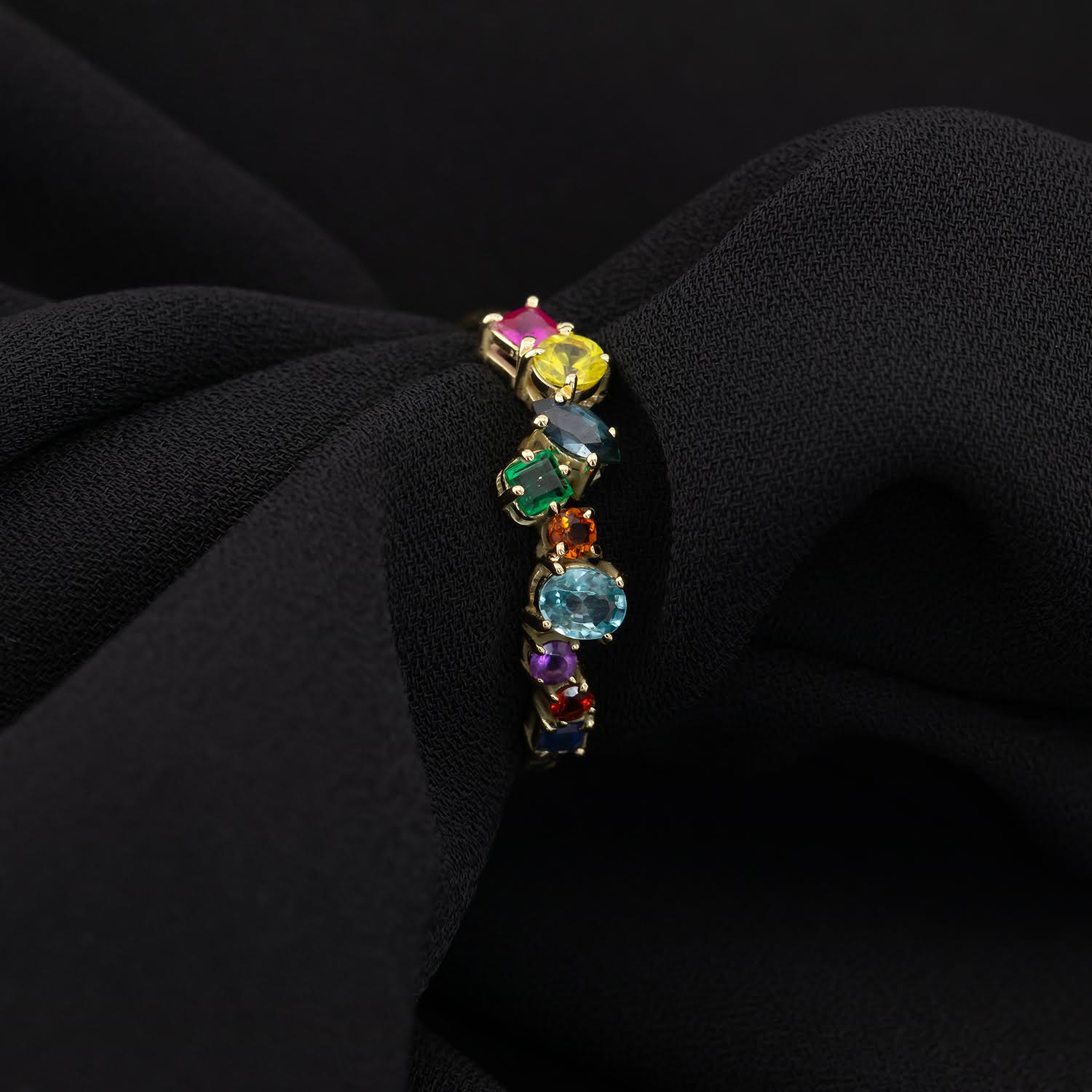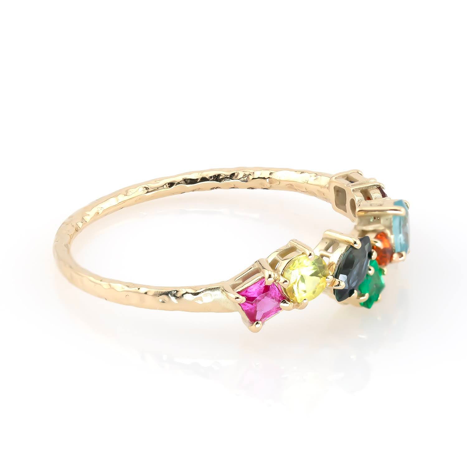 Un inel vibrant și plin de viață, realizat din aur galben de 14K, împodobit cu o varietate de pietre prețioase în culori intense. Fiecare piatră este atent montată pentru a crea un curcubeu spectaculos de nuanțe și forme. Designul sofisticat și detaliile lucrate manual adaugă o notă de unicitate și expresivitate. Ideal pentru a sărbători momente speciale sau pentru a aduce un strop de culoare în fiecare zi, acest inel este o declarație de stil și bucurie.