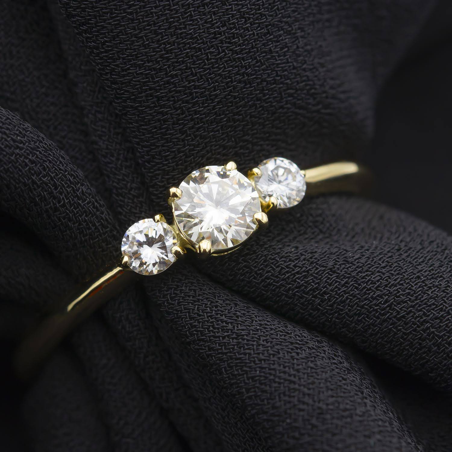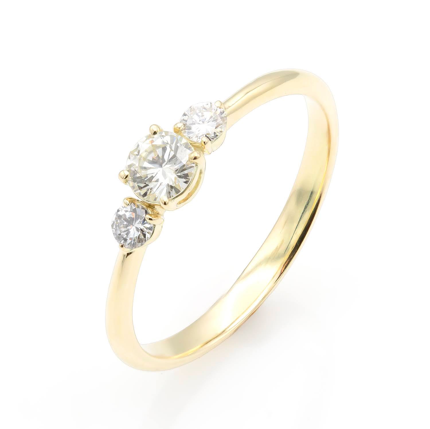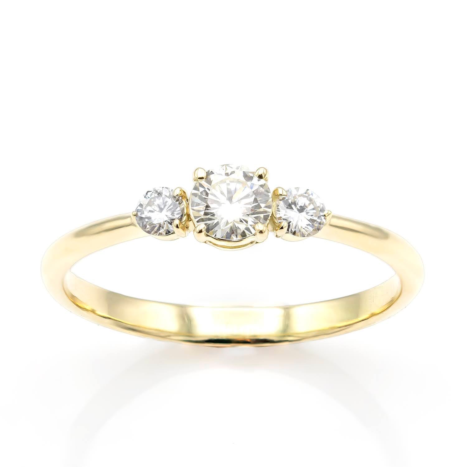 Un simbol al trecutului, prezentului și viitorului, acest inel de logodnă din aur galben este decorat cu trei diamante strălucitoare. Diamantul central, mai mare, este flancat de două diamante mai mici, care subliniază frumusețea și semnificația acestei bijuterii. Designul simplu și elegant pune în valoare pietrele prețioase, oferind o estetică atemporală. Ideal pentru a marca un angajament plin de promisiuni, acest inel este o alegere perfectă pentru cei care apreciază rafinamentul și simbolismul profund.