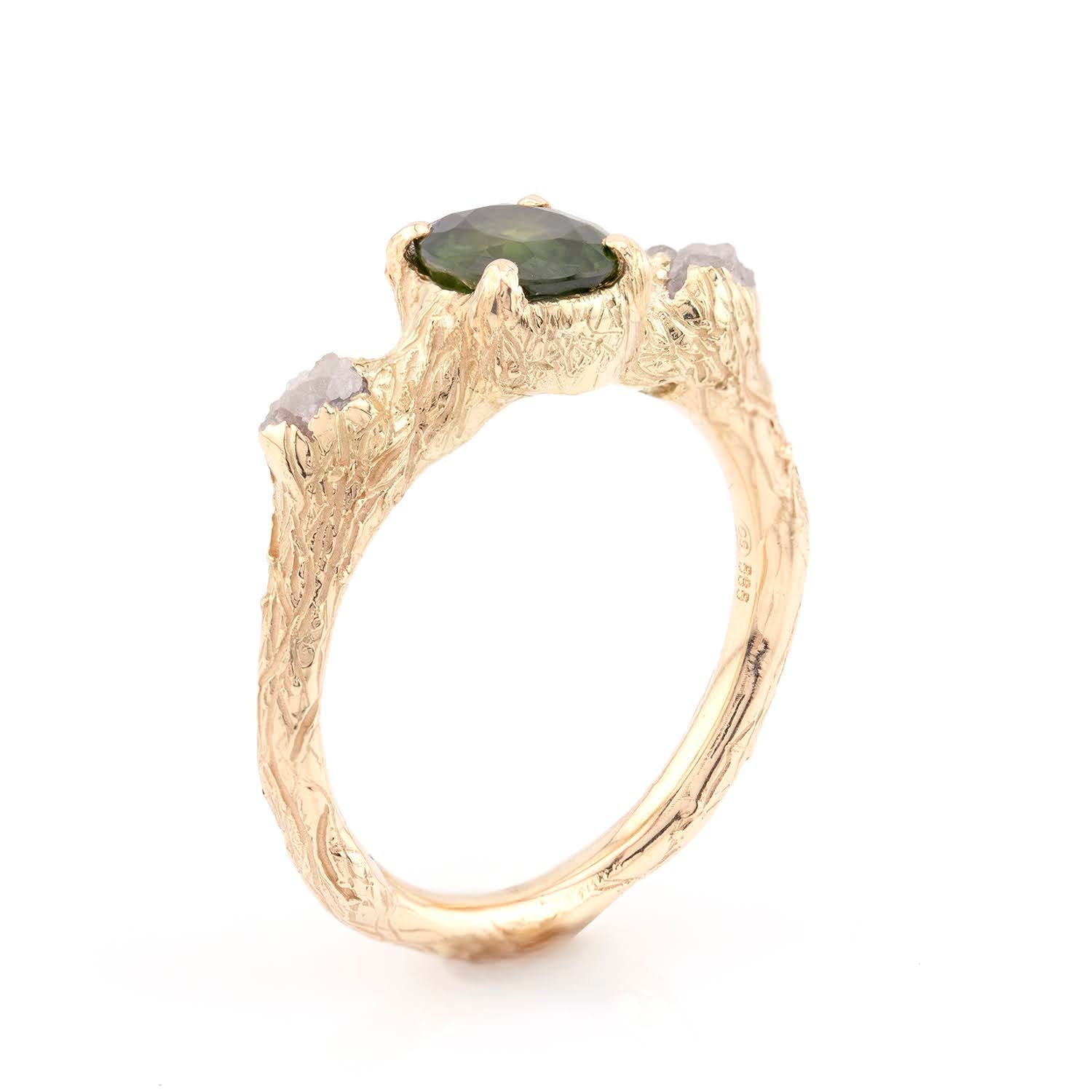 O creație deosebită ce combină frumusețea naturală cu un design unic, acest inel din aur se remarcă printr-un safir verde captivant și diamante brute care adaugă un aer organic și autentic. Structura aurului este atent texturată, evocând forme naturale, iar montura subliniază farmecul pietrelor prețioase. Ideal pentru cei care apreciază bijuteriile neconvenționale, acest inel simbolizează eleganța naturală și rafinamentul brut. O piesă perfectă pentru a celebra momente unice sau pentru a adăuga un accent artistic colecției de bijuterii.
