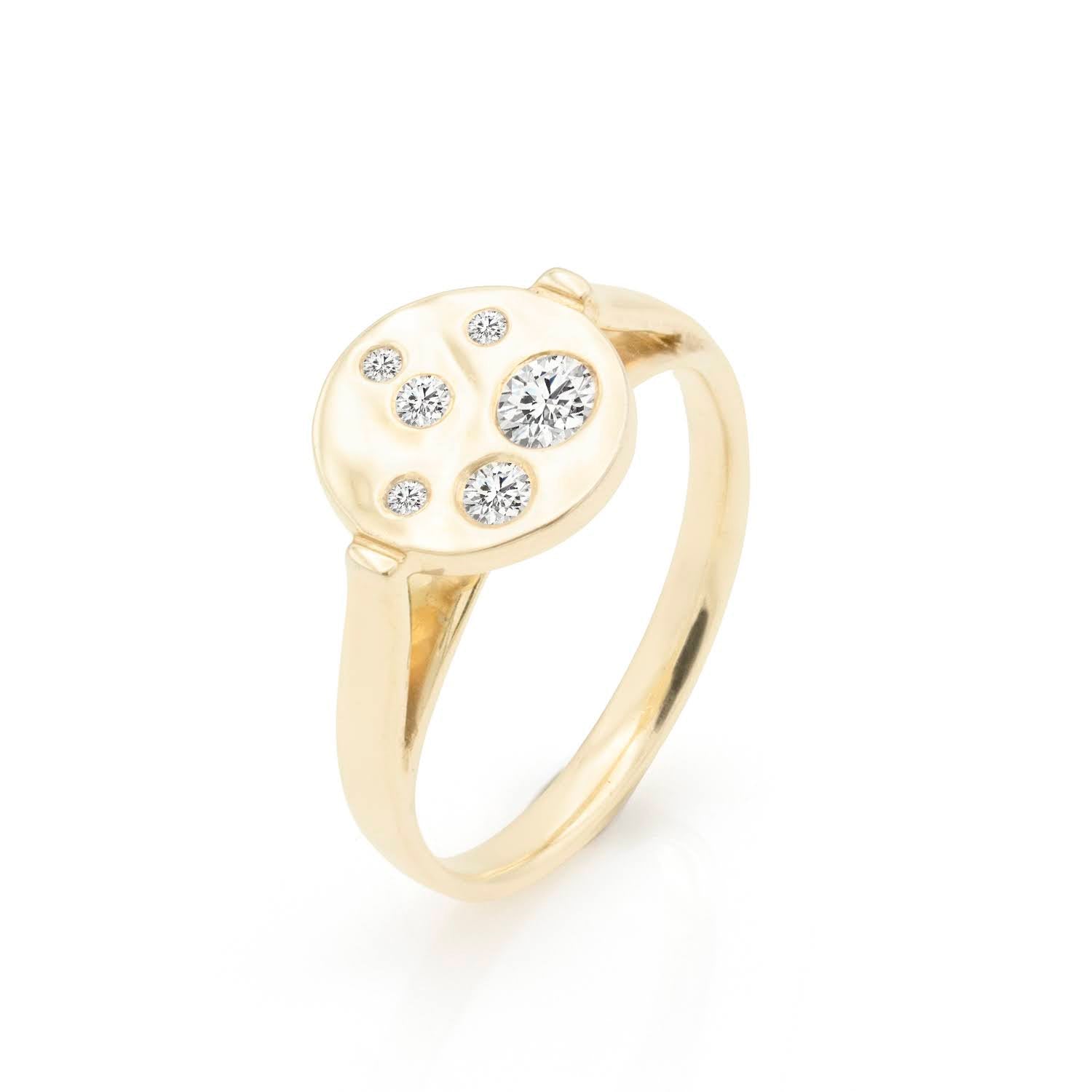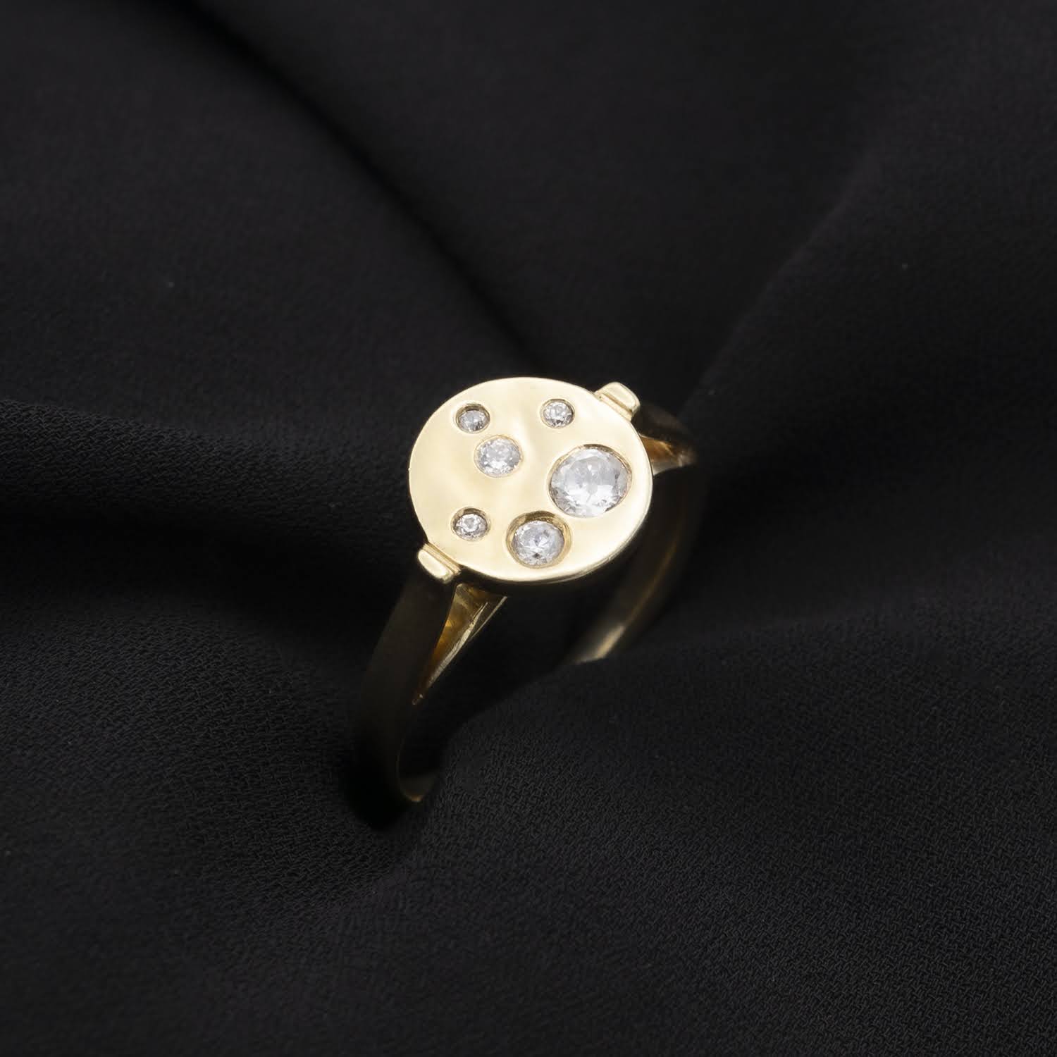 Un inel inspirat de farmecul misterios al nopții, realizat din aur strălucitor și decorat cu diamante delicate care dansează ca stelele pe suprafața sa. Centrul inelului, rotunjit precum luna plină, găzduiește un diamant central strălucitor, înconjurat de pietre mai mici ce adaugă profunzime și lumină. Designul modern și poetic transformă această bijuterie într-un simbol al iubirii eterne și al momentelor prețioase împărtășite sub cerul înstelat.