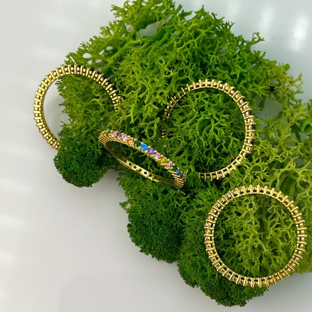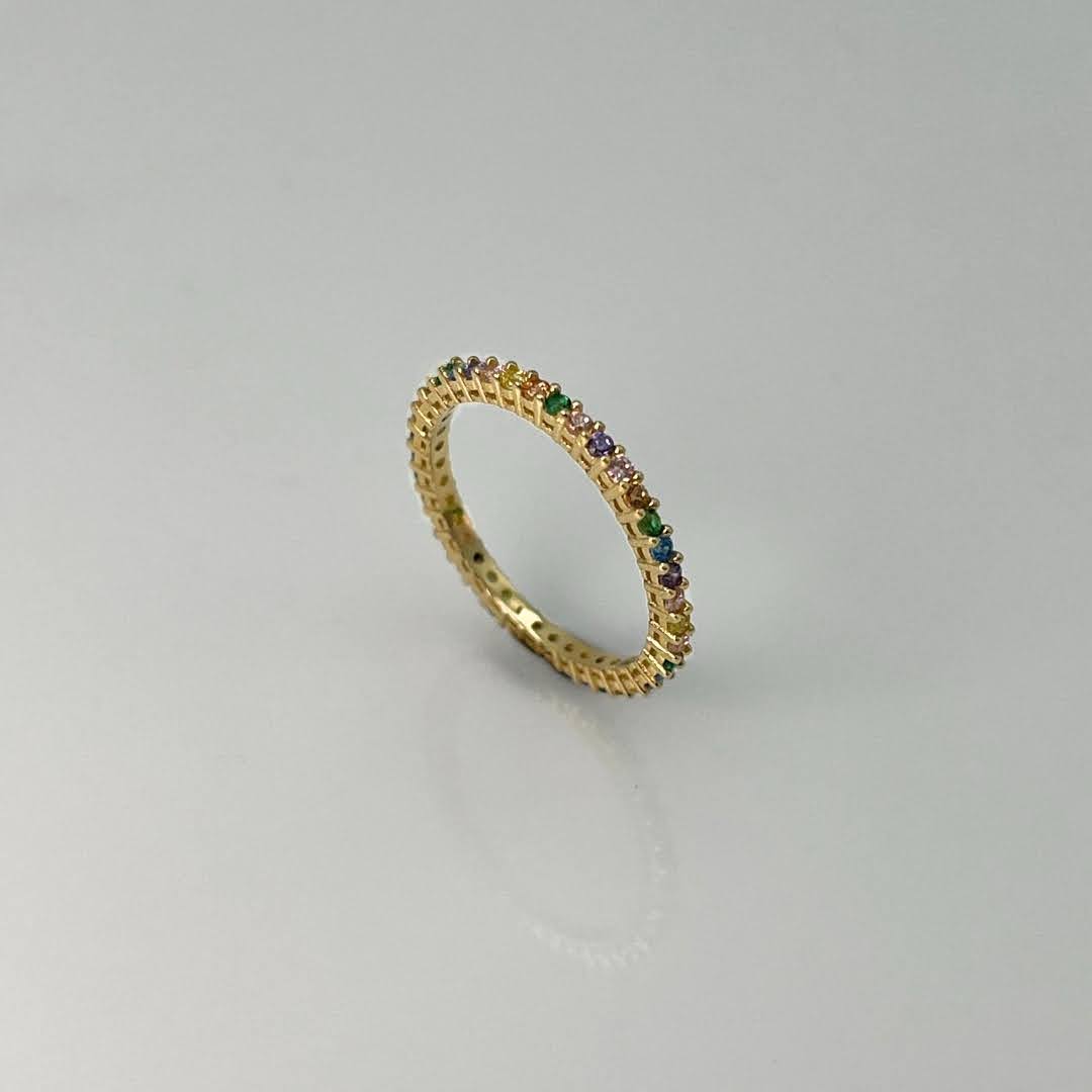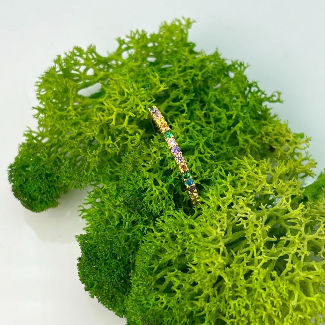 Un joc de culori care prinde viață odată cu fiecare mișcare a mâinii. Inelul Eternity din aur de 14K combină precizia formelor cu energia pietrelor colorate, creând o piesă plină de optimism și rafinament.