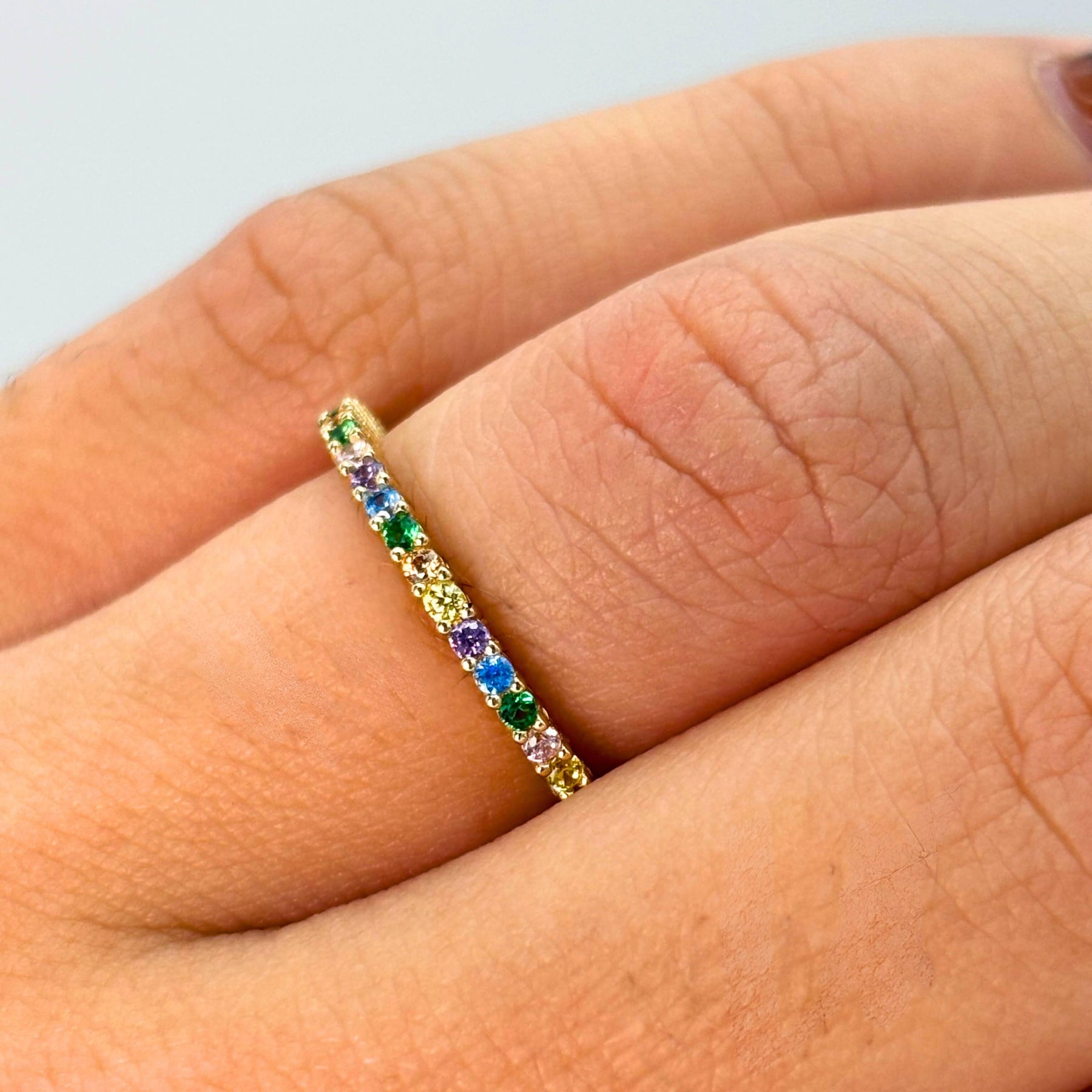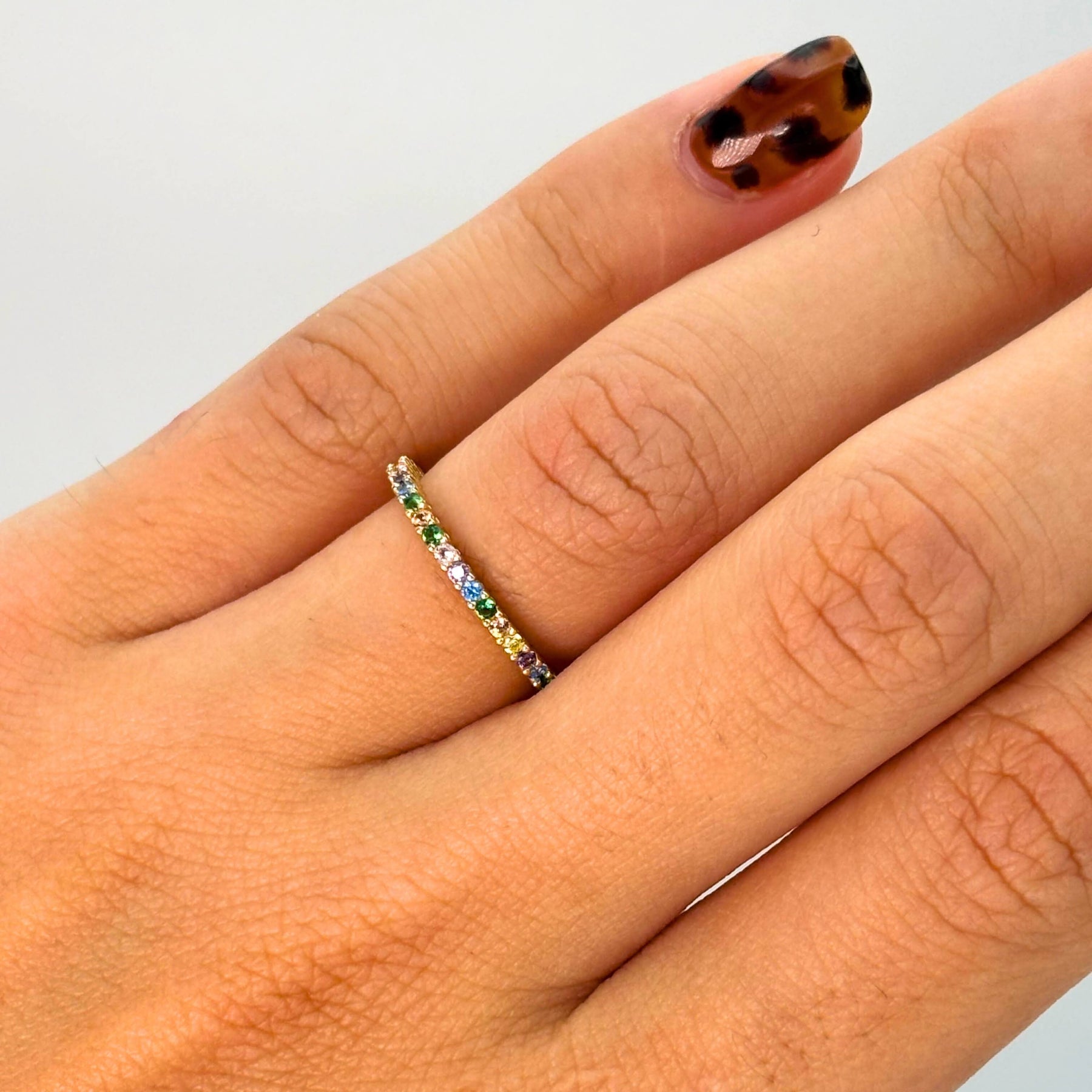 Fiecare nuanță adaugă o notă de bucurie, iar șirul perfect al pietrelor creează o linie fluidă de lumină. Este un inel care se poartă cu zâmbetul pe buze — discret, dar imposibil de trecut cu vederea.