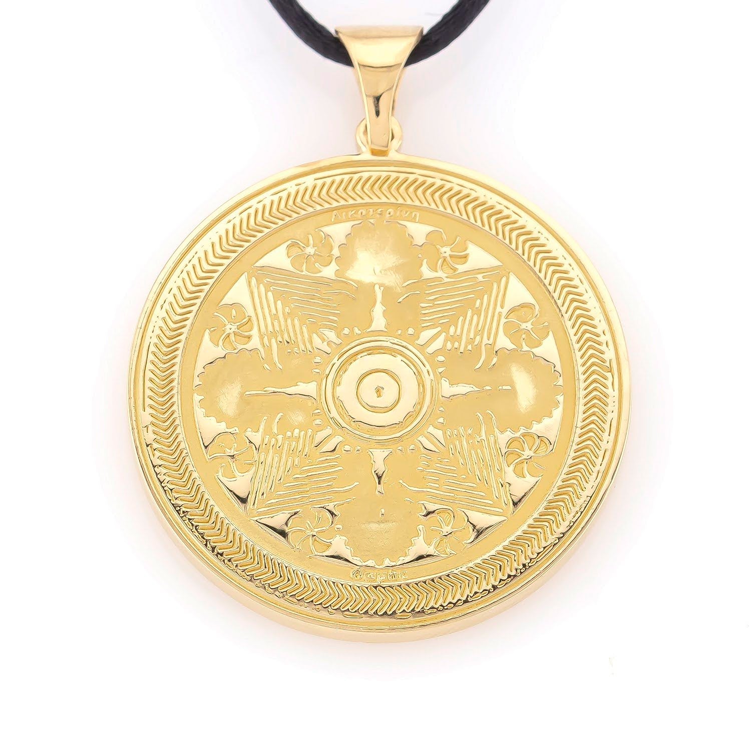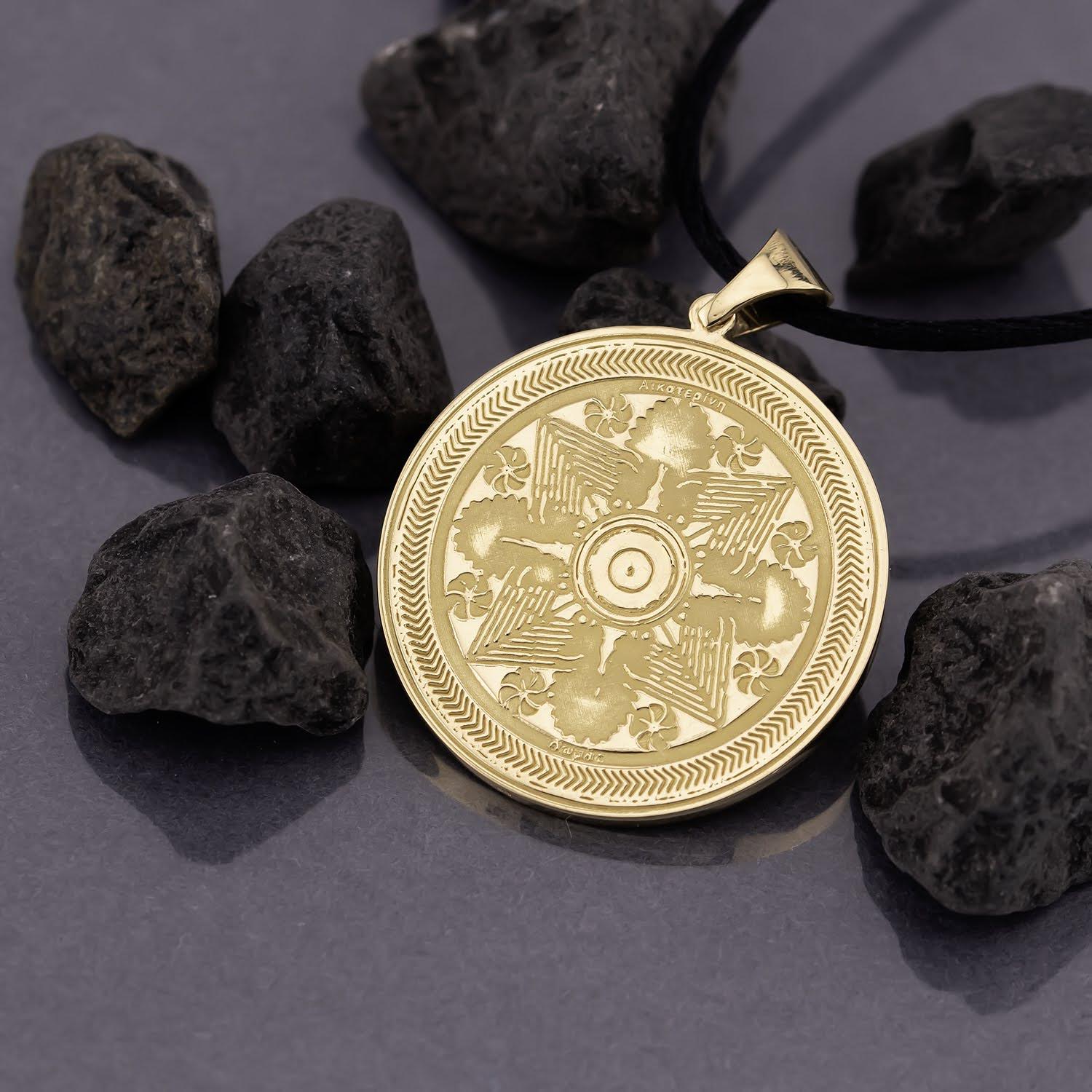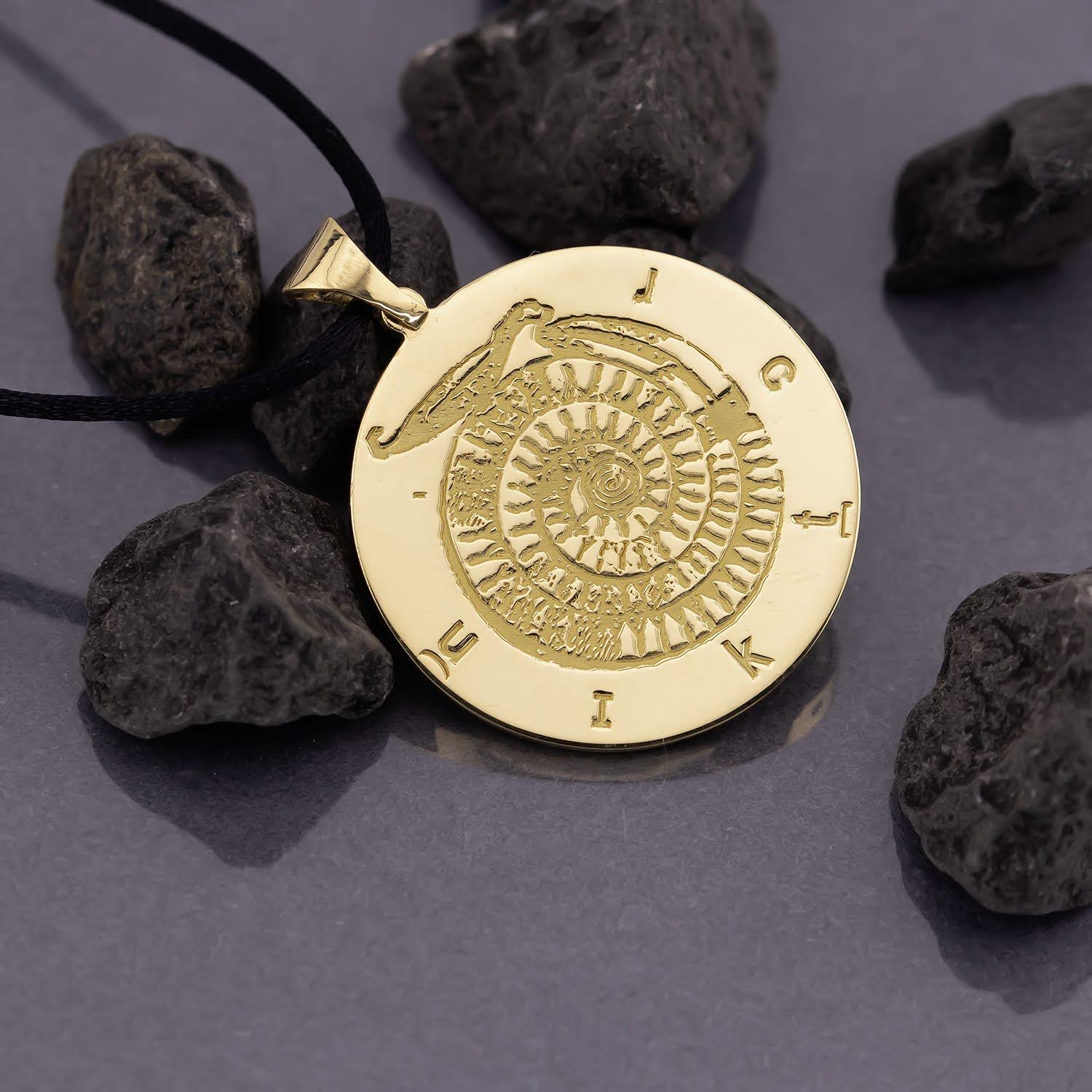 Un pandantiv impresionant în formă de monedă, realizat din aur galben de 18k, gravat cu simboluri detaliate ce aduc un aer de mister și semnificație. Designul său este unic, fiecare parte a pandantivului fiind decorată cu motive distincte – o combinație între tradiție și eleganță modernă. Fiecare detaliu gravat reflectă măiestria artizanilor, transformând acest pandantiv într-o piesă statement. Perfect pentru a fi purtat ca accesoriu distinctiv sau ca simbol al poveștilor personale, acest pandantiv este o alegere rafinată și plină de semnificație.