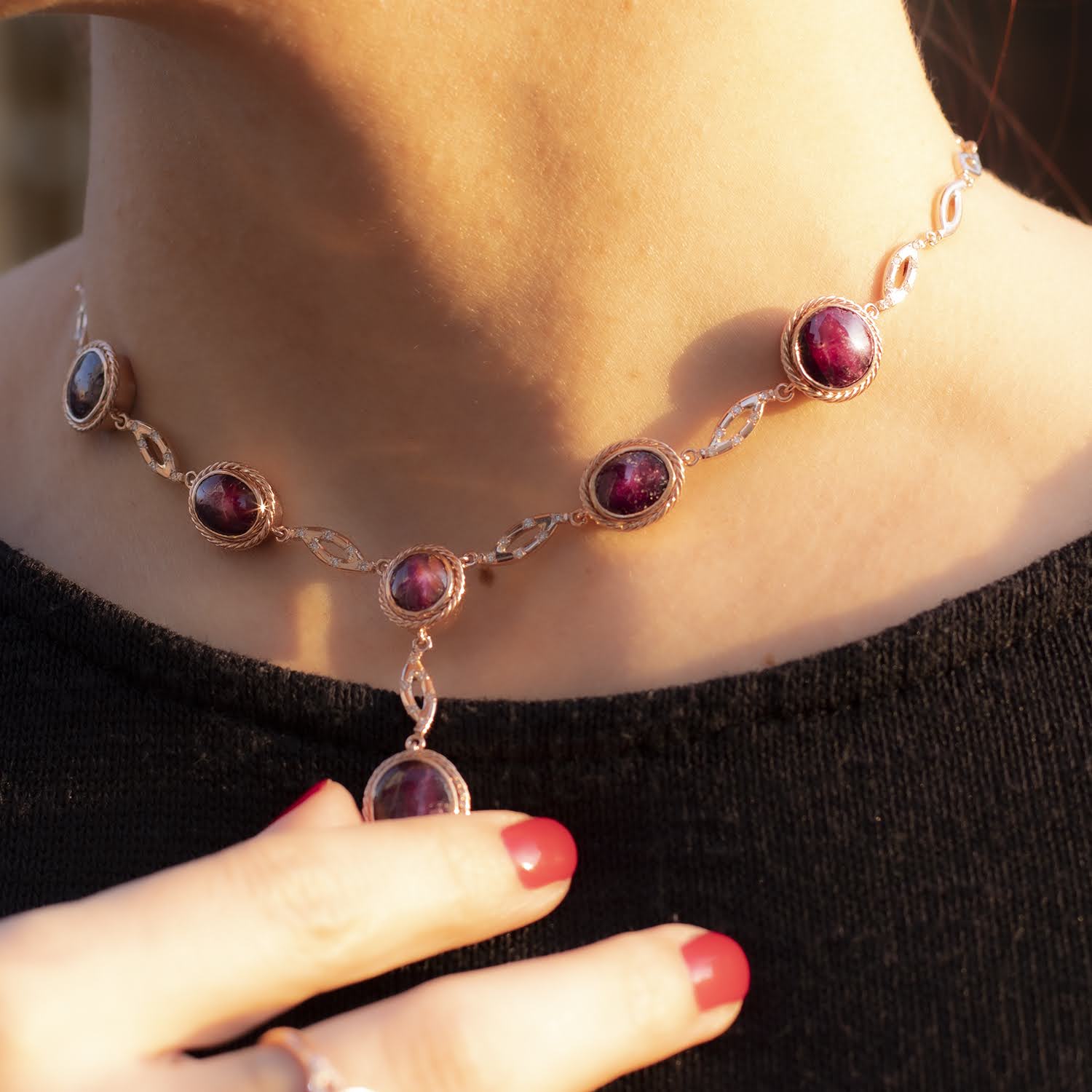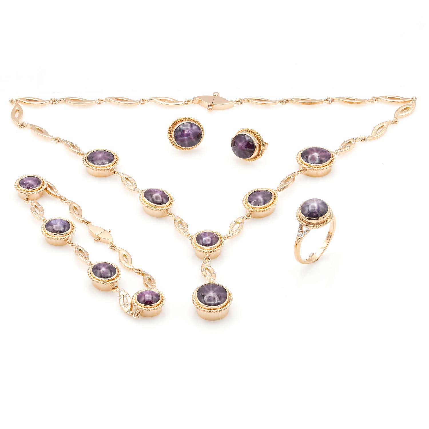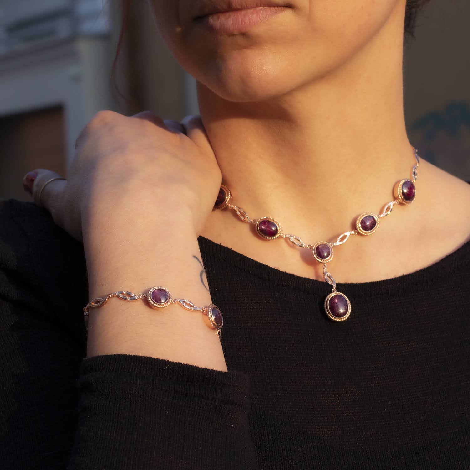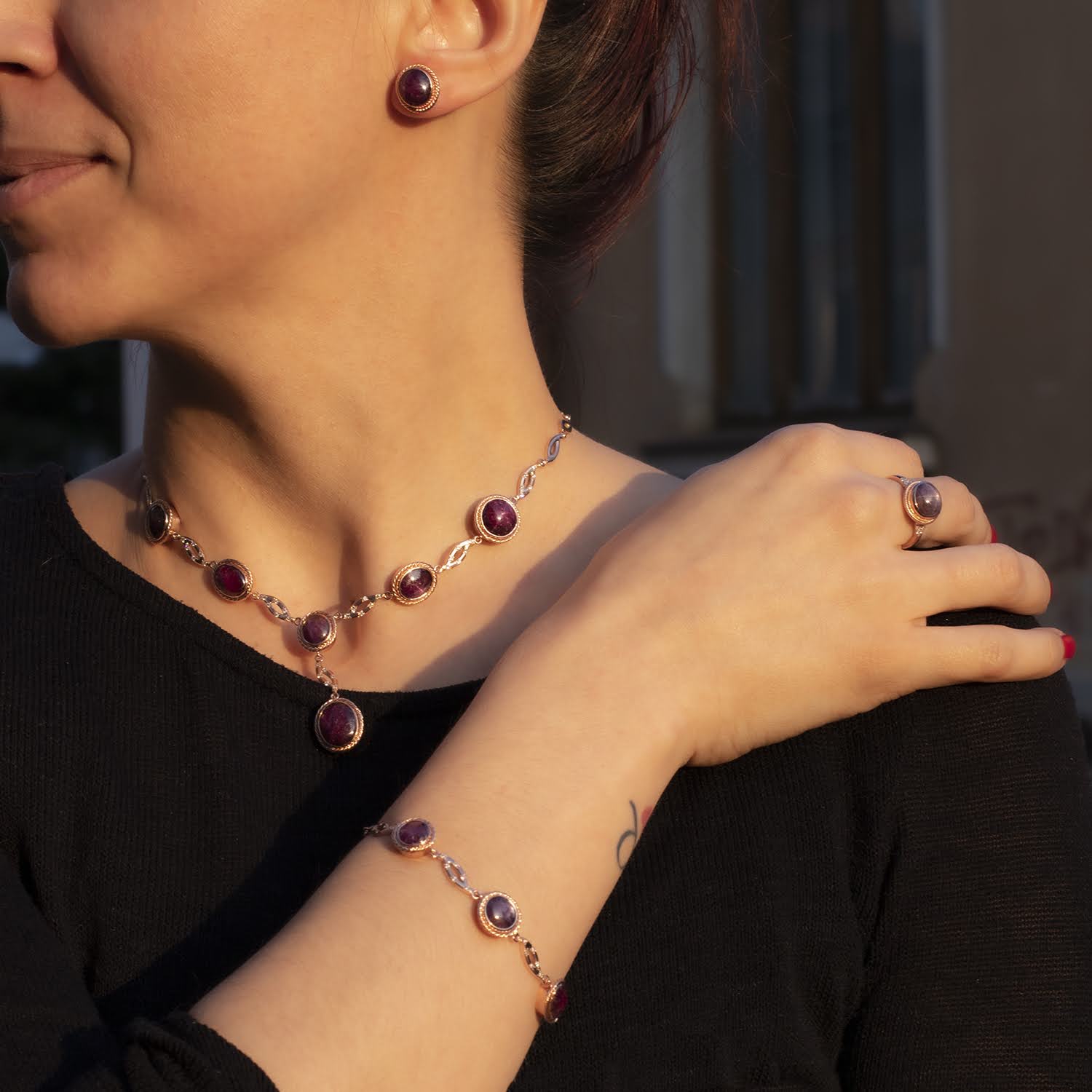 Un set impresionant realizat din aur de 14k și rubine, perfect pentru a reflecta rafinamentul și splendoarea. Fiecare piesă din acest set – colierul, brățara, cerceii și inelul – este creată cu măiestrie, punând în valoare frumusețea naturală a rubinelor cu nuanțe bogate și intense. Designul elegant și detaliile delicate transformă acest set într-un simbol al eleganței și luxului, ideal pentru a adăuga un plus de grație și rafinament fiecărui moment special.