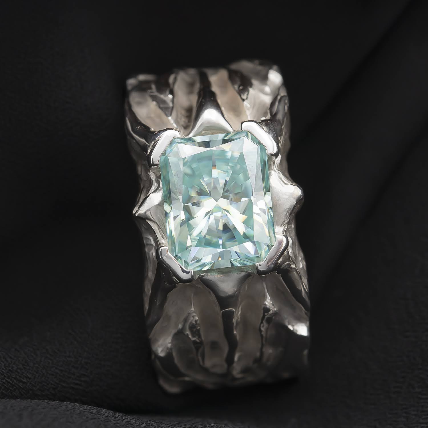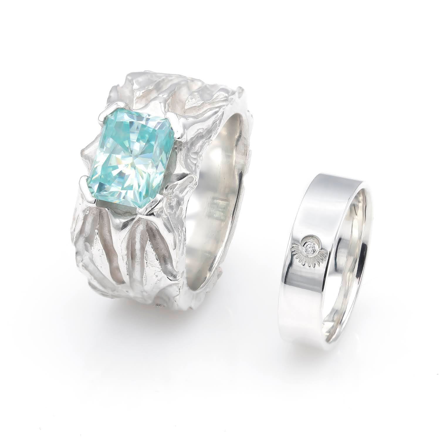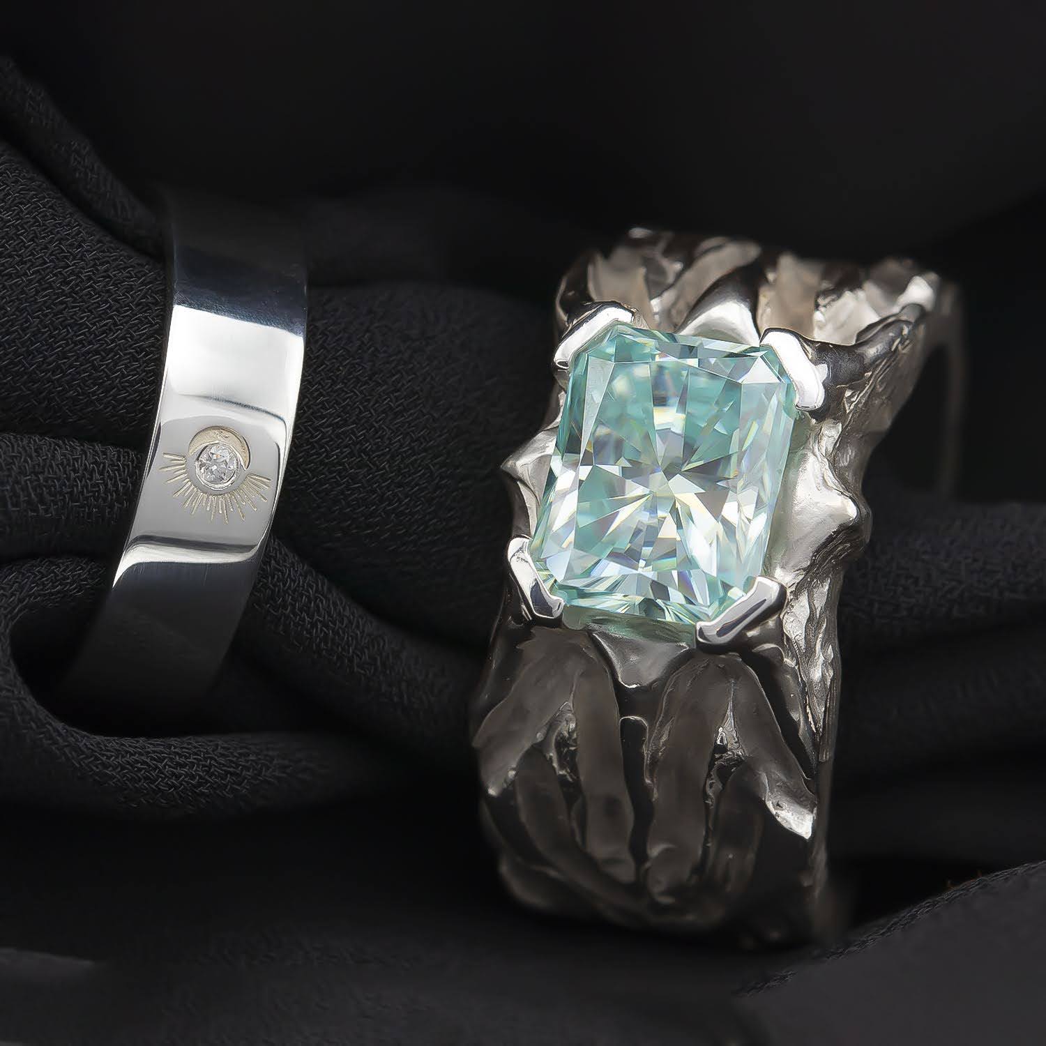 Aceste verighete din argint se remarcă prin designul lor distinctiv și eleganța sofisticată, fiind decorate cu moisanit, o piatră prețioasă cunoscută pentru strălucirea și durabilitatea sa. Una dintre verighete are un design texturat, accentuat de o montură îndrăzneață ce pune în valoare moisanitul central de dimensiuni generoase, în timp ce cealaltă are un finisaj simplu și modern, evidențiat de un detaliu gravat cu un moisanit delicat în centru. Acest set simbolizează armonia dintre stiluri contrastante, perfect pentru cuplurile care apreciază unicitatea și rafinamentul. Un simbol al unei legături durabile și pline de semnificație.