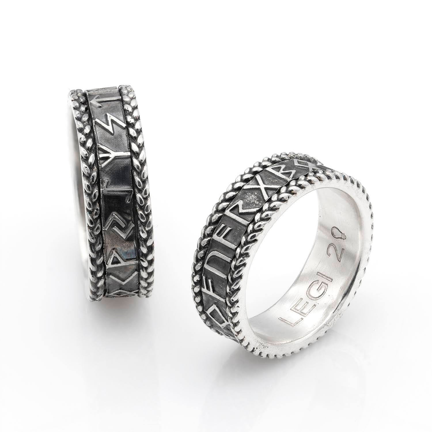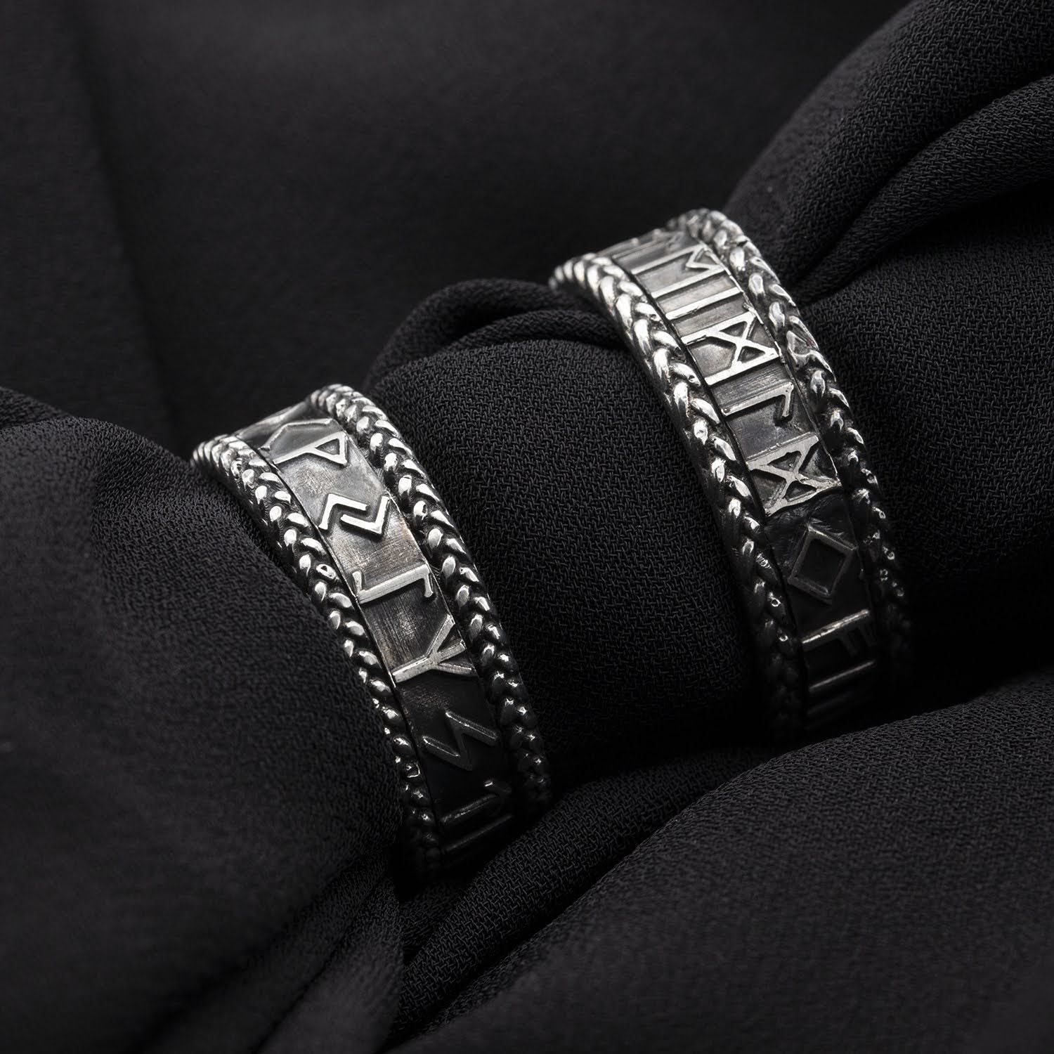 Un set unic de inele din argint patinat, inspirate de simbolurile runice și de estetica tradițională nordică. Marginile împletite adaugă un detaliu sofisticat și un caracter artizanal, iar gravurile runice de pe suprafața centrală conferă un aer mistic și plin de semnificații. Fiecare inel este o celebrare a simbolismului și a legăturii dintre tradiție și modernitate, perfect pentru cei care doresc să poarte o piesă cu poveste și personalitate.