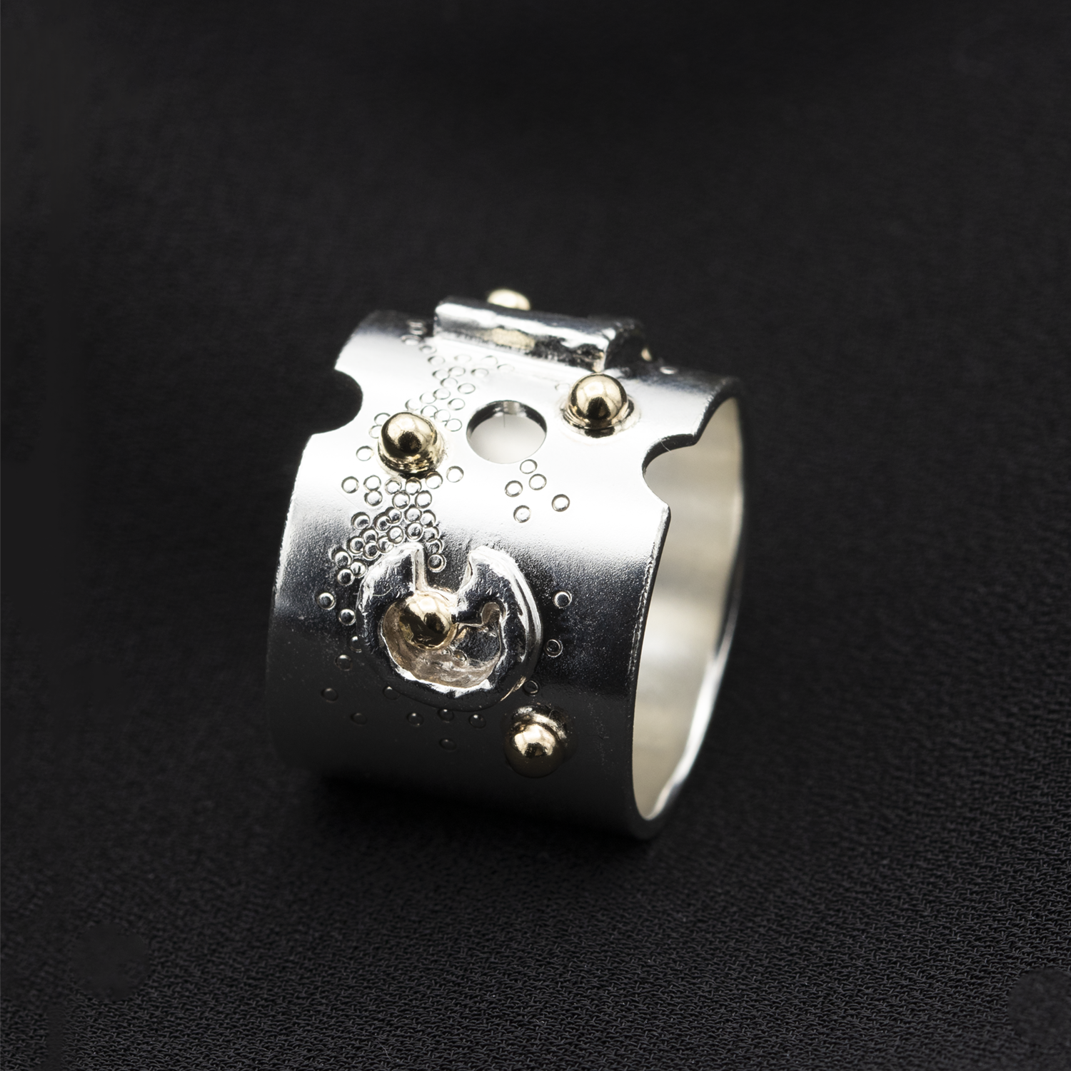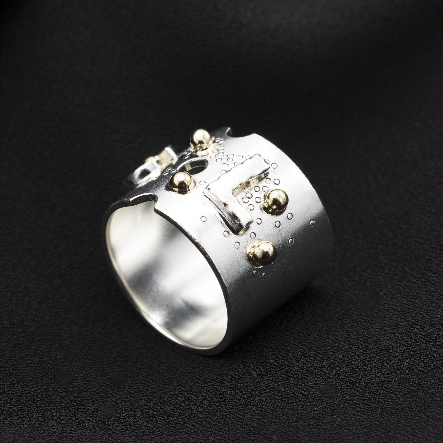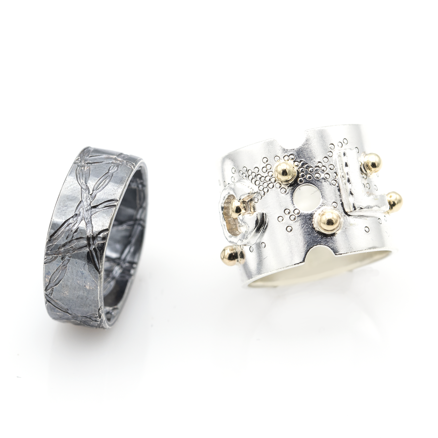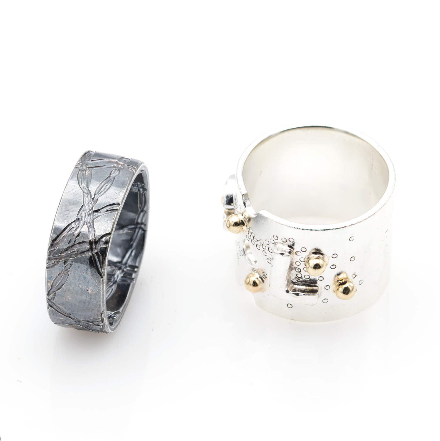 Verighete din argint, lucrate manual, ce îmbină eleganța clasică cu detalii unice, de inspirație artistică. Designul fiecărei piese reflectă creativitatea și individualitatea purtătorilor, cu texturi și accente de aur ce adaugă un contrast subtil și sofisticat. Fiecare verighetă este o declarație a iubirii atemporale, perfectă pentru cuplurile care își doresc o notă distinctă și personalizată în simbolul uniunii lor. Un amestec de tradiție și modernitate, conceput pentru a rezista în timp și a păstra povești prețioase.