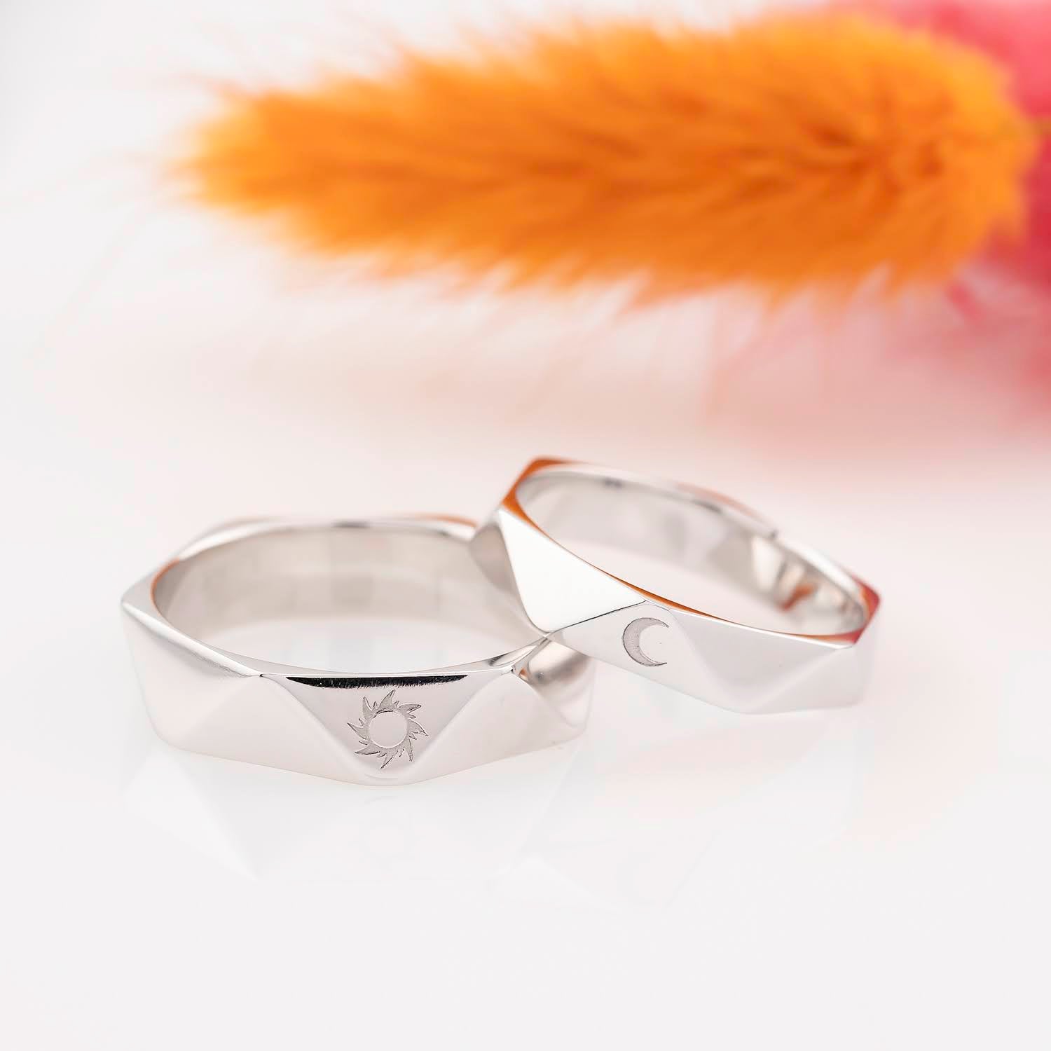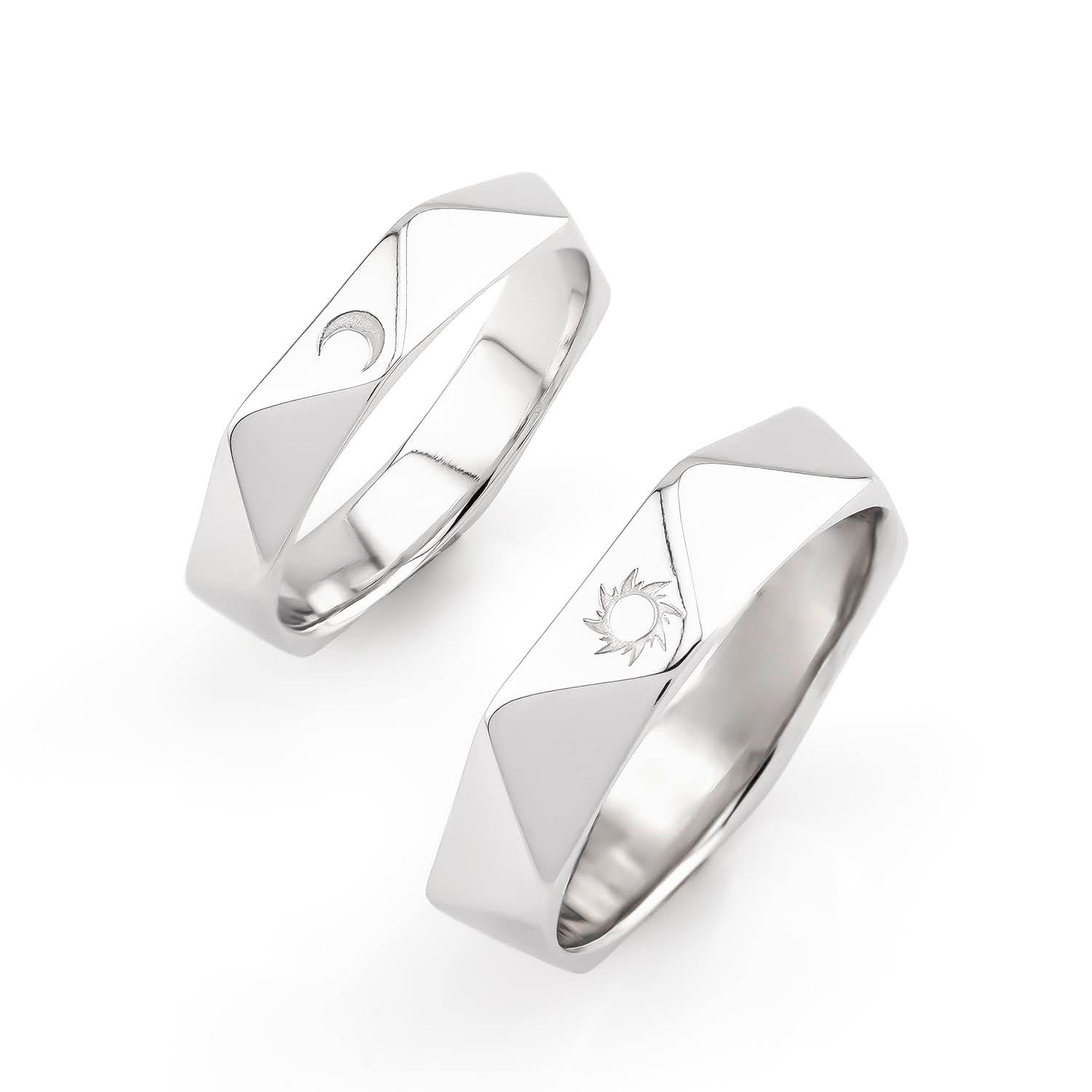 Aceste verighete simbolizează echilibrul perfect dintre Soare și Lună, reflectând armonia dintre două suflete care se completează reciproc. Realizate din aur alb, designul lor modern este accentuat de gravuri delicate ce înfățișează simbolurile Soarelui și Lunii, aducând o notă personalizată și semnificativă. Formele geometrice conferă un aer contemporan, în timp ce mesajul subtil al pieselor evocă legătura eternă dintre cei care le poartă. Perfecte pentru a marca un angajament de neuitat, aceste verighete îmbină stilul rafinat cu simbolismul profund, fiind o alegere ideală pentru cuplurile care caută bijuterii cu semnificație aparte.