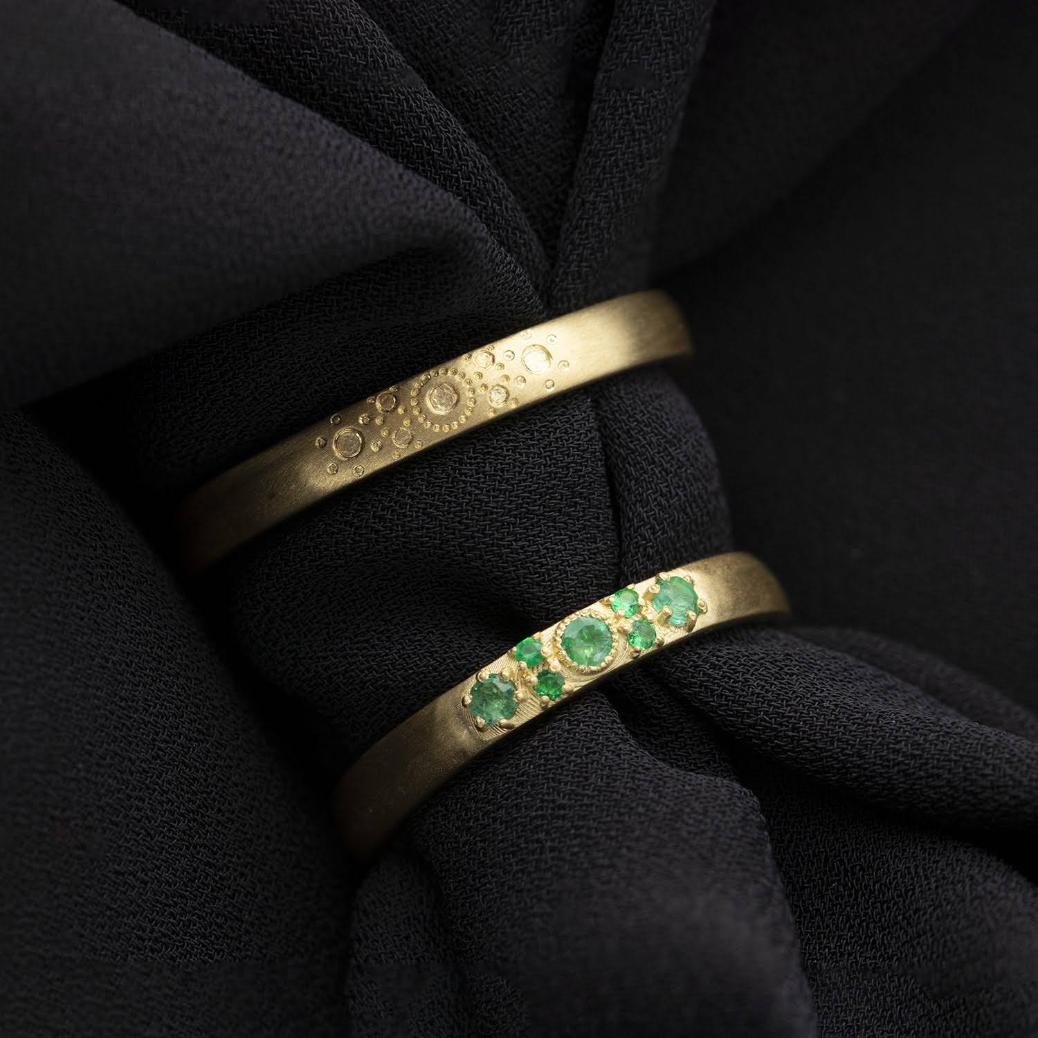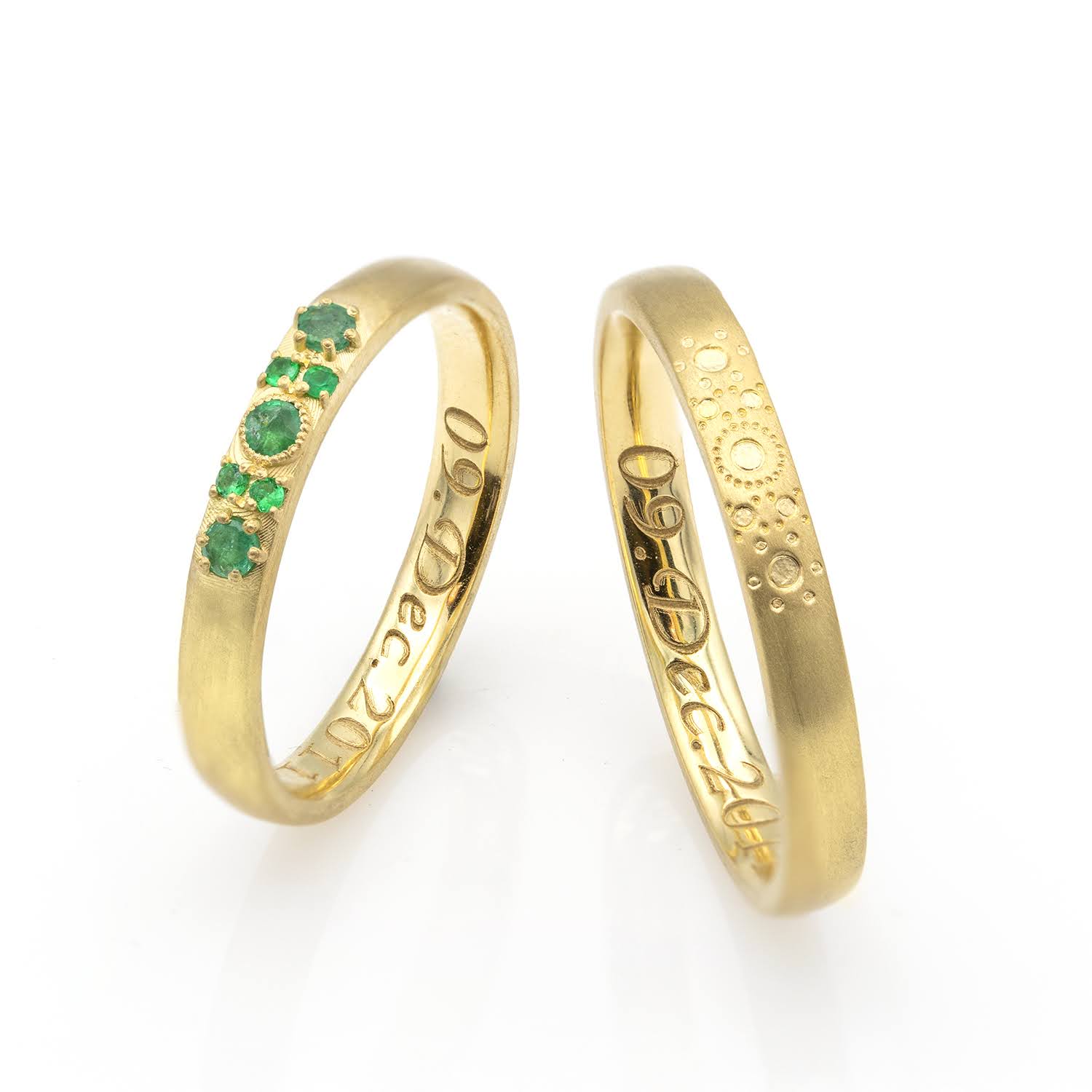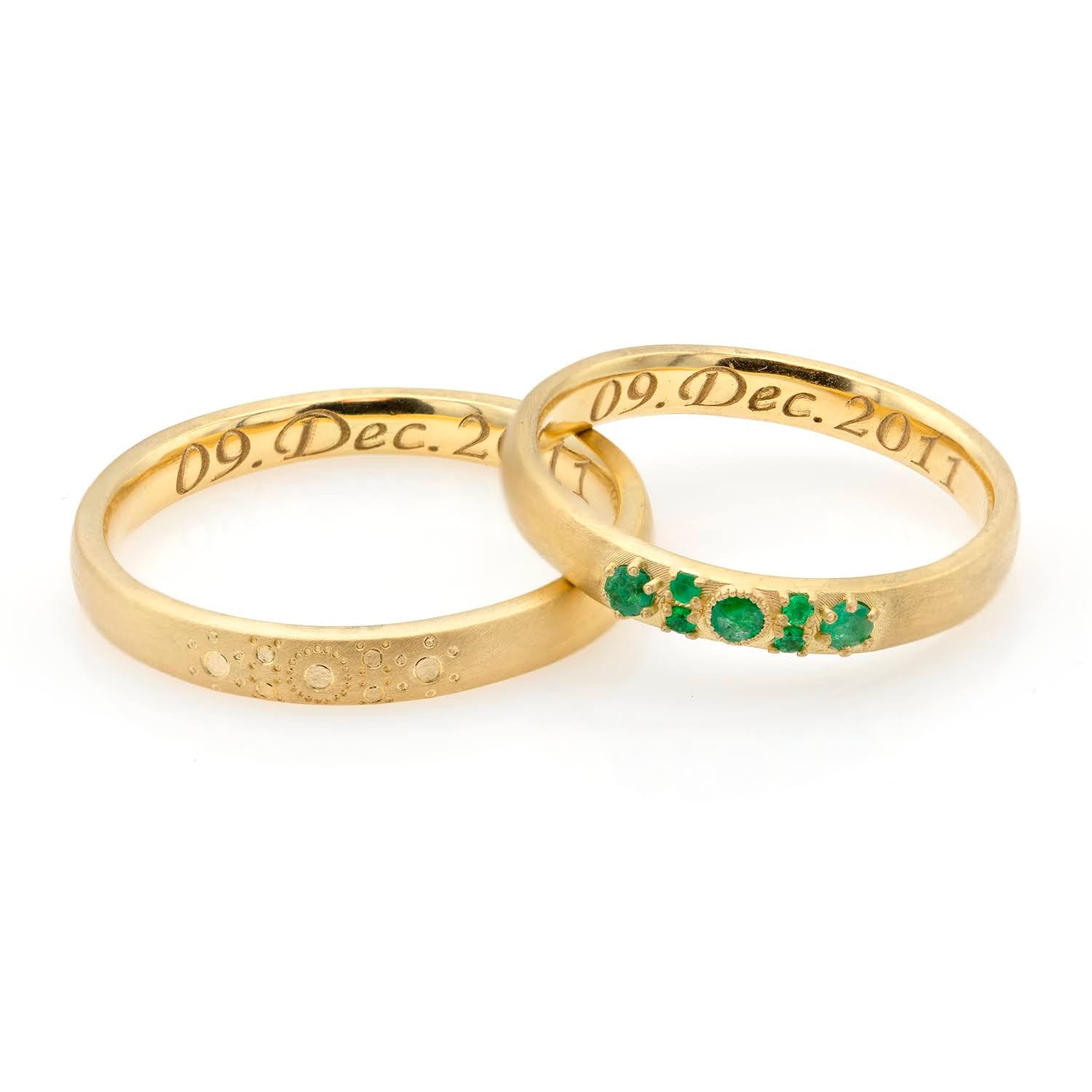 Aceste verighete din aur galben se remarcă prin designul lor personalizat, cu detalii subtile și simboluri distincte. Una dintre verighete este decorată cu o serie de smaralde de diferite dimensiuni, montate delicat, conferindu-i o notă de eleganță și culoare. Cealaltă verighetă prezintă un model gravat, cu un motiv solar stilizat, adăugând unicitate și simbolism. În interior, ambele verighete au inscripționat un mesaj personal sau o dată specială, evidențiind caracterul lor sentimental și personalizat. Ideale pentru cupluri care doresc verighete autentice și pline de semnificație.