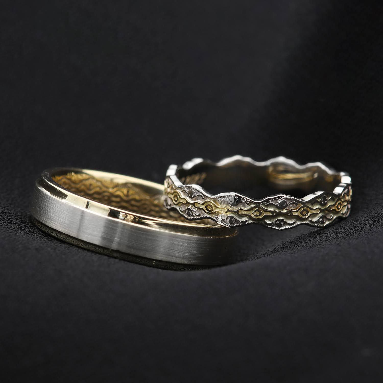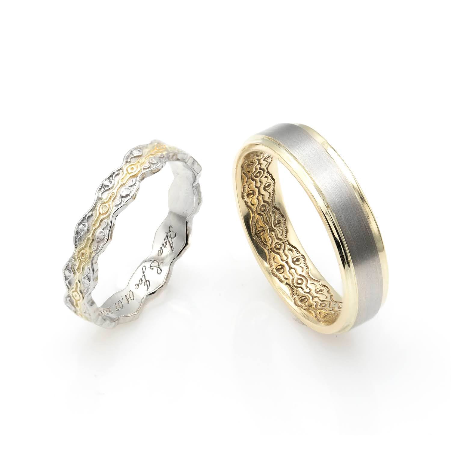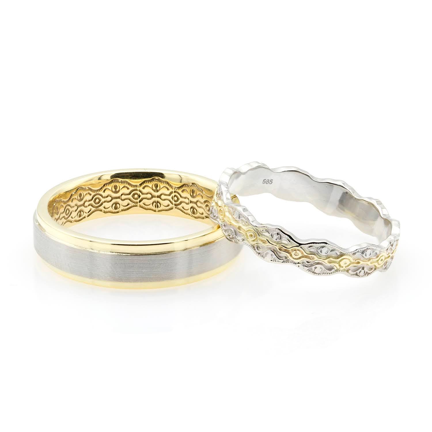 Aceste verighete deosebite sunt realizate dintr-o combinație armonioasă de aur alb și aur galben, evidențiind un design unic și sofisticat. Verigheta feminină impresionează prin modelul de dantelă gravată la exterior, conferindu-i un aspect delicat și romantic. Verigheta masculină adoptă un stil clasic, completat de detalii de dantelă gravate discret pe interior, adăugând un element personal și elegant. Perfecte pentru cuplurile care apreciază combinația de tradiție și modernitate, aceste verighete simbolizează o legătură unică și atemporală.