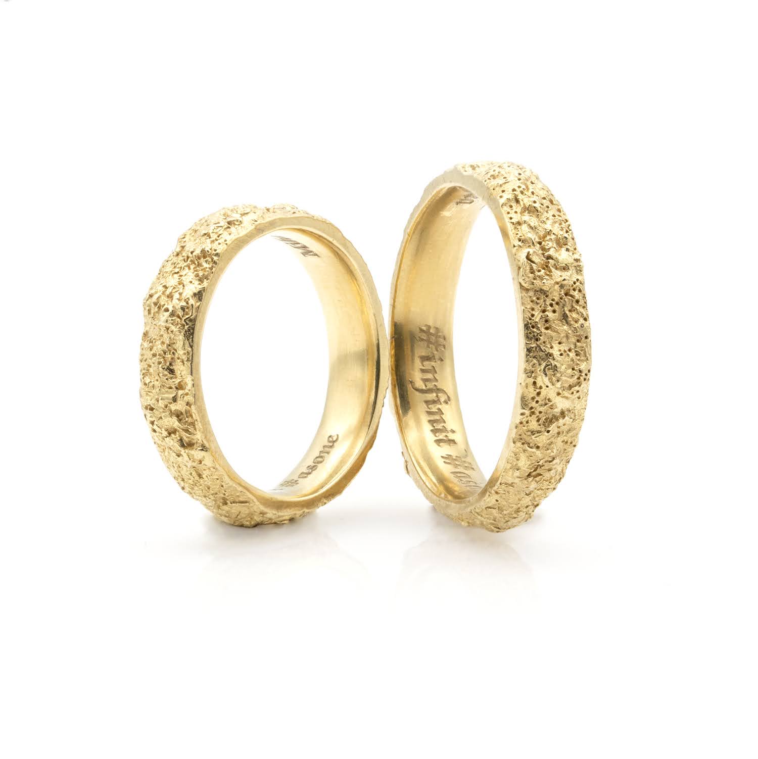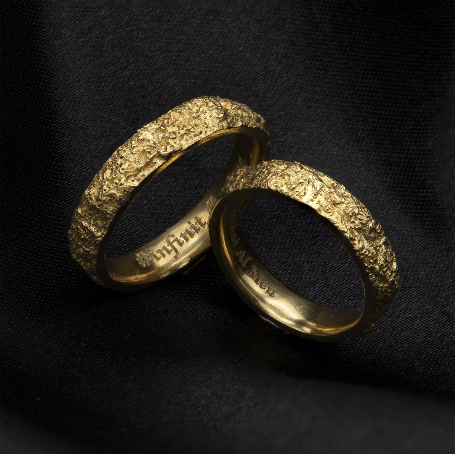 Verighete din aur galben de 14k, cu un finisaj unic, ce evocă textura naturală a pietrei, simbolizând rezistența și profunzimea iubirii. Designul organic, lucrat cu atenție la detalii, îmbină estetica modernă cu elemente inspirate din natură, oferind un caracter aparte fiecărei piese. Aceste verighete nu doar celebrează legătura dintre două suflete, ci și adaugă un strop de originalitate poveștii voastre. Un simbol autentic al unui angajament etern, creat să dureze o viață.