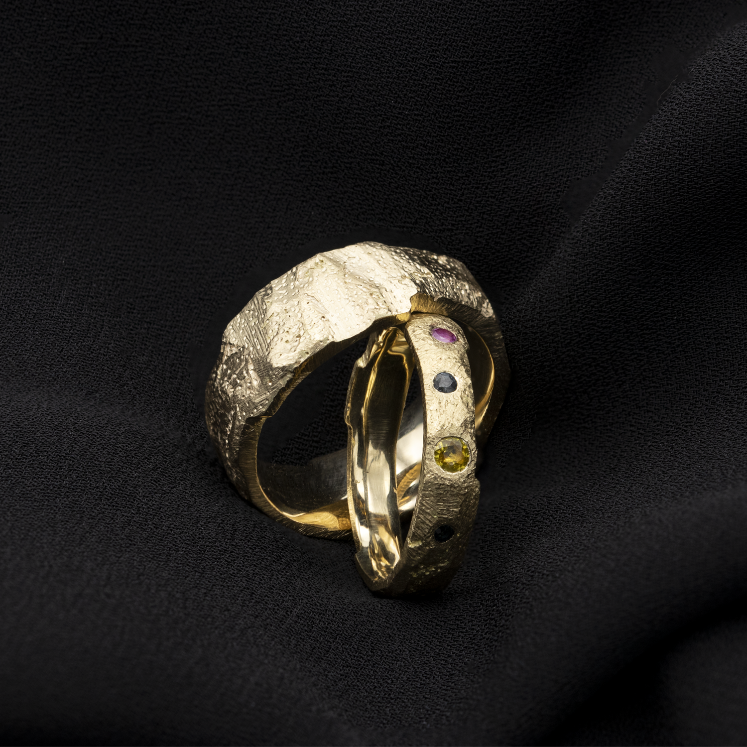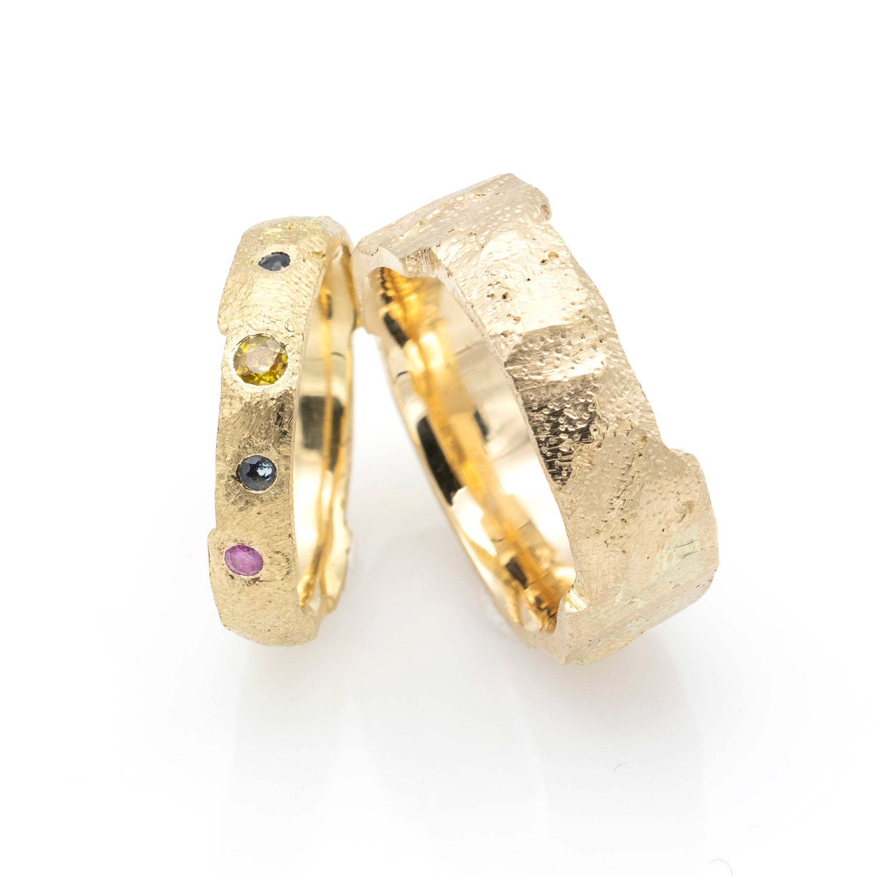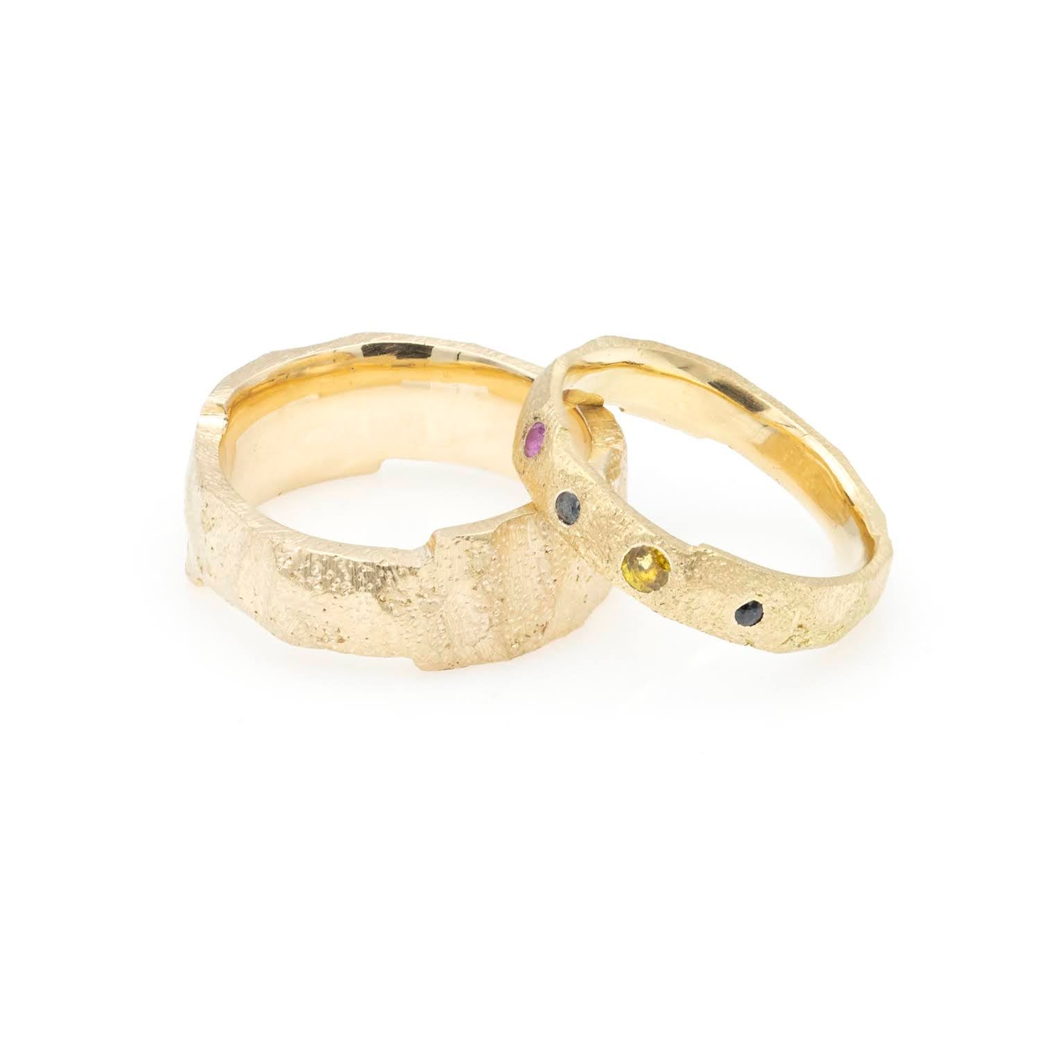 Verighetele „Preistoric” sunt o celebrare a legăturilor primordiale și a frumuseții naturale, realizate din aur de 14k cu un design inspirat de texturile și formele brute ale epocii de început. Cu detalii organice și margini sculpturale, fiecare inel reflectă unicitatea fiecărei relații. Modelele includ pietre prețioase colorate, adăugând o notă de vitalitate și individualitate. O alegere ideală pentru cei care caută simboluri autentice ale iubirii și durabilității.
