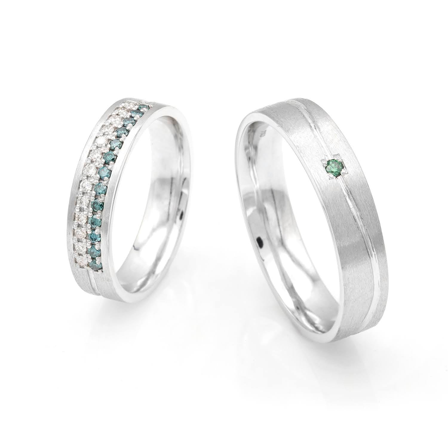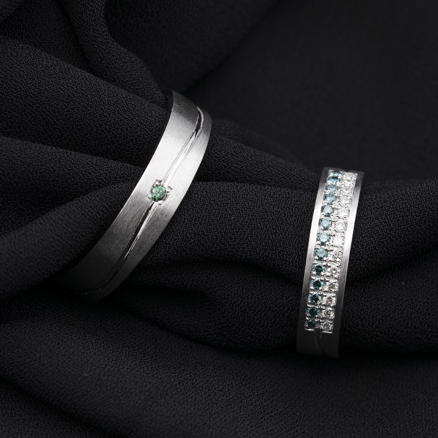 Aceste verighete elegante combină rafinamentul designului modern cu frumusețea pietrelor prețioase. Realizate din aur alb, fiecare verighetă este decorată cu diamante albe și albastre, care adaugă un contrast subtil și o notă de unicitate. Verigheta feminină este încrustată cu un șir delicat de diamante strălucitoare, în timp ce cea masculină prezintă un diamant albastru discret, accentuat de un finisaj mat. Simboluri ale iubirii și ale legăturii eterne, aceste verighete sunt perfecte pentru cuplurile care apreciază eleganța și originalitatea.
