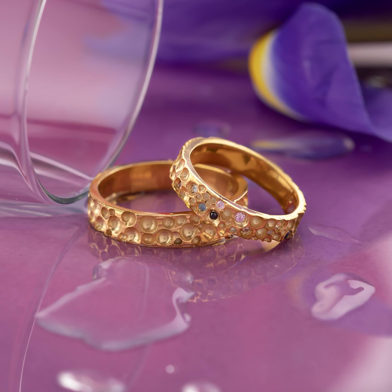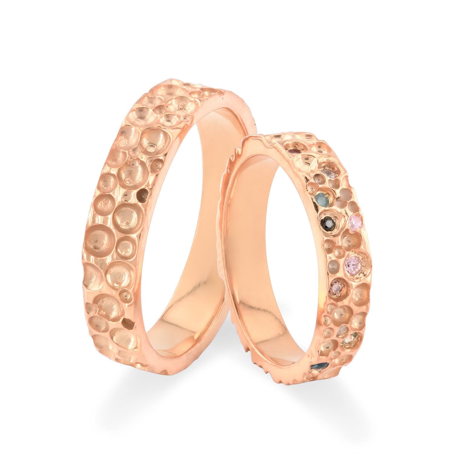 Una dintre verighete este decorată cu pietre fine montate manual, integrate organic în textură. Detaliile prețioase adaugă un accent subtil de culoare și strălucire, păstrând în același timp echilibrul cu designul brut, artizanal.