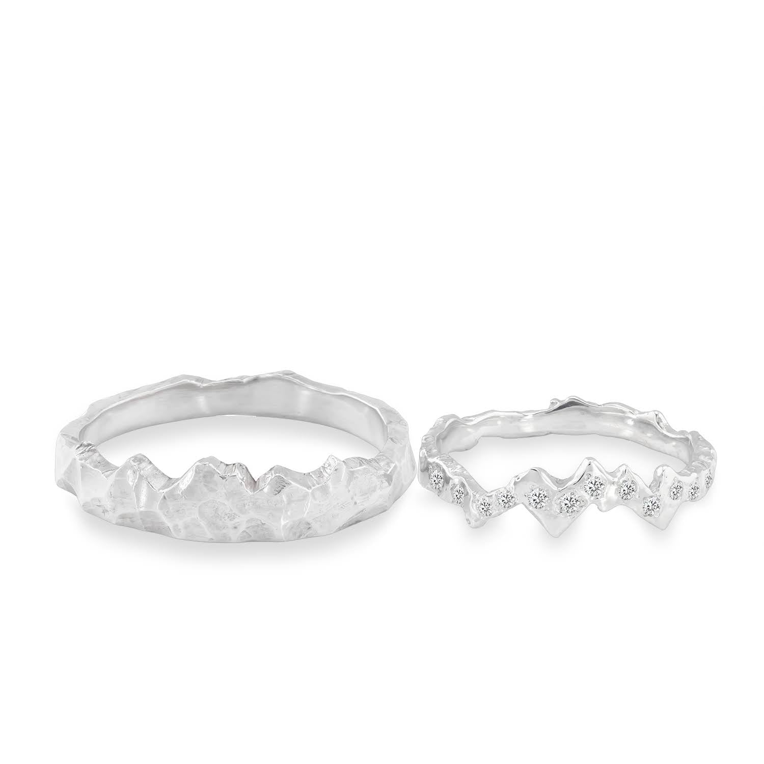 Cele două verighete sunt diferite, dar gândite să se completeze: una cu un relief mai amplu, cealaltă cu un ritm mai fin, creând un dialog vizual subtil. Împreună, ele simbolizează două individualități distincte unite într-o formă armonioasă.