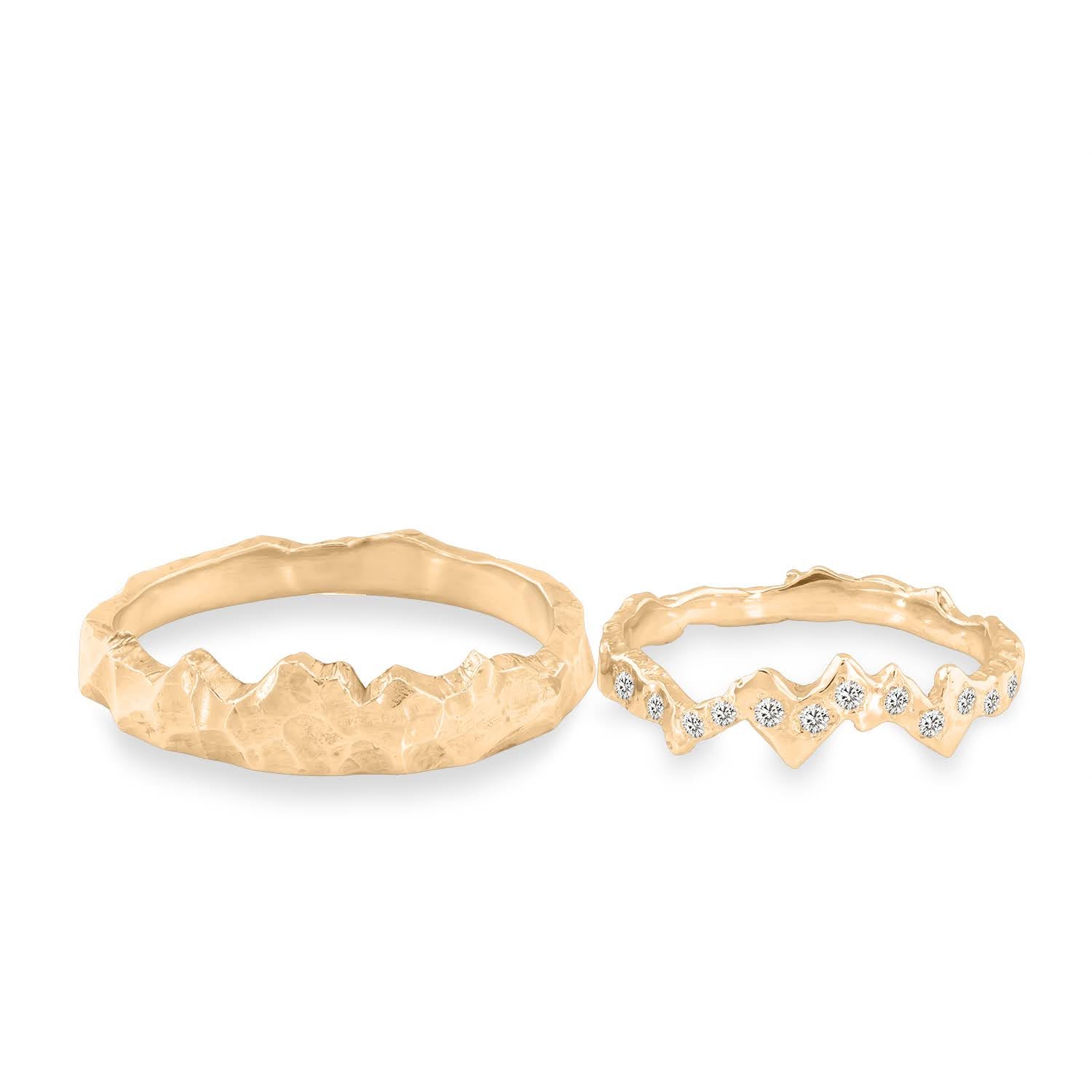 Această pereche de verighete este realizată manual din aur și se distinge printr-un design sculptural, cu relief neregulat, inspirat din formele naturale ale peisajelor modelate de timp. Textura puternică și marginile ușor frânte conferă pieselor un caracter autentic și expresiv.
